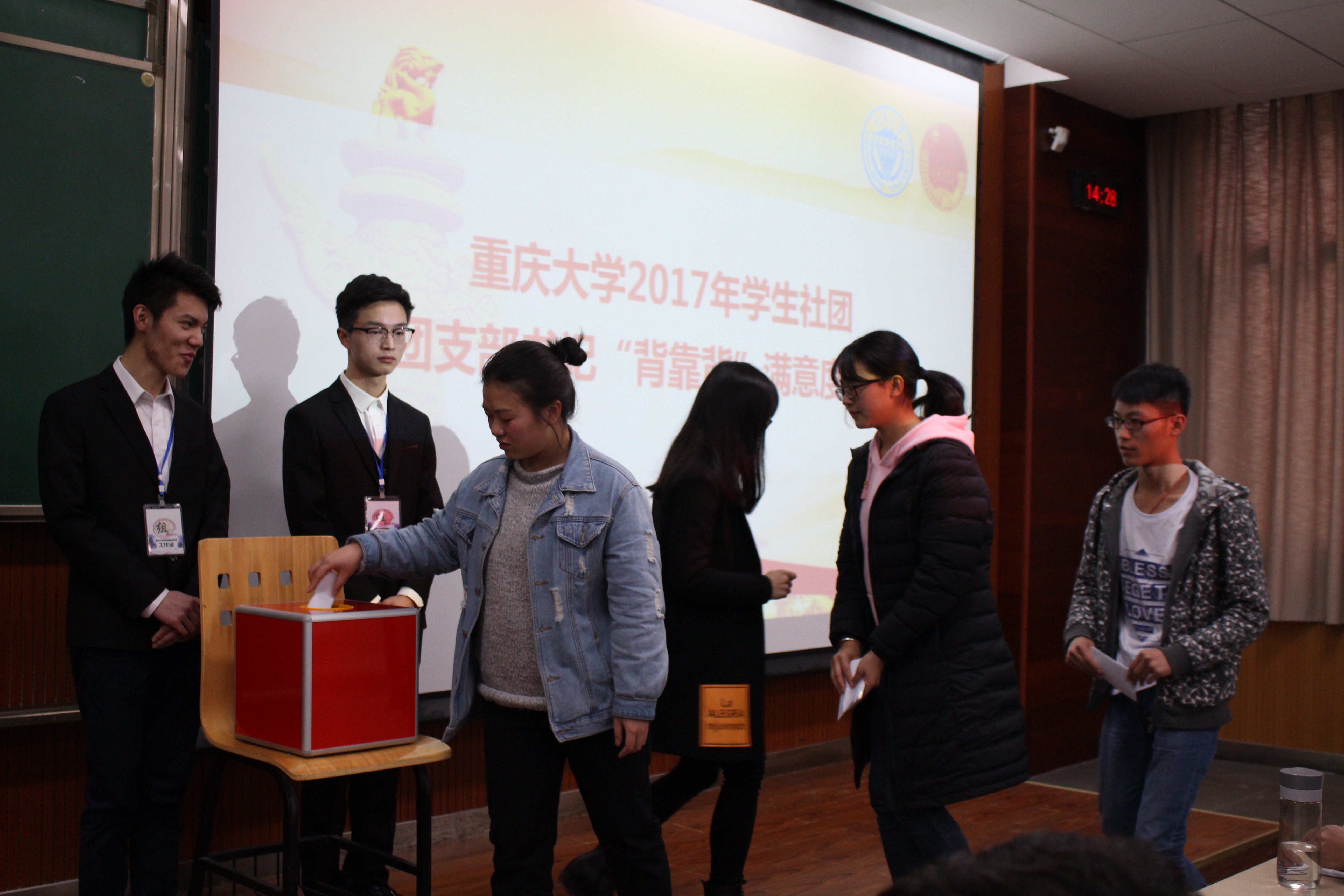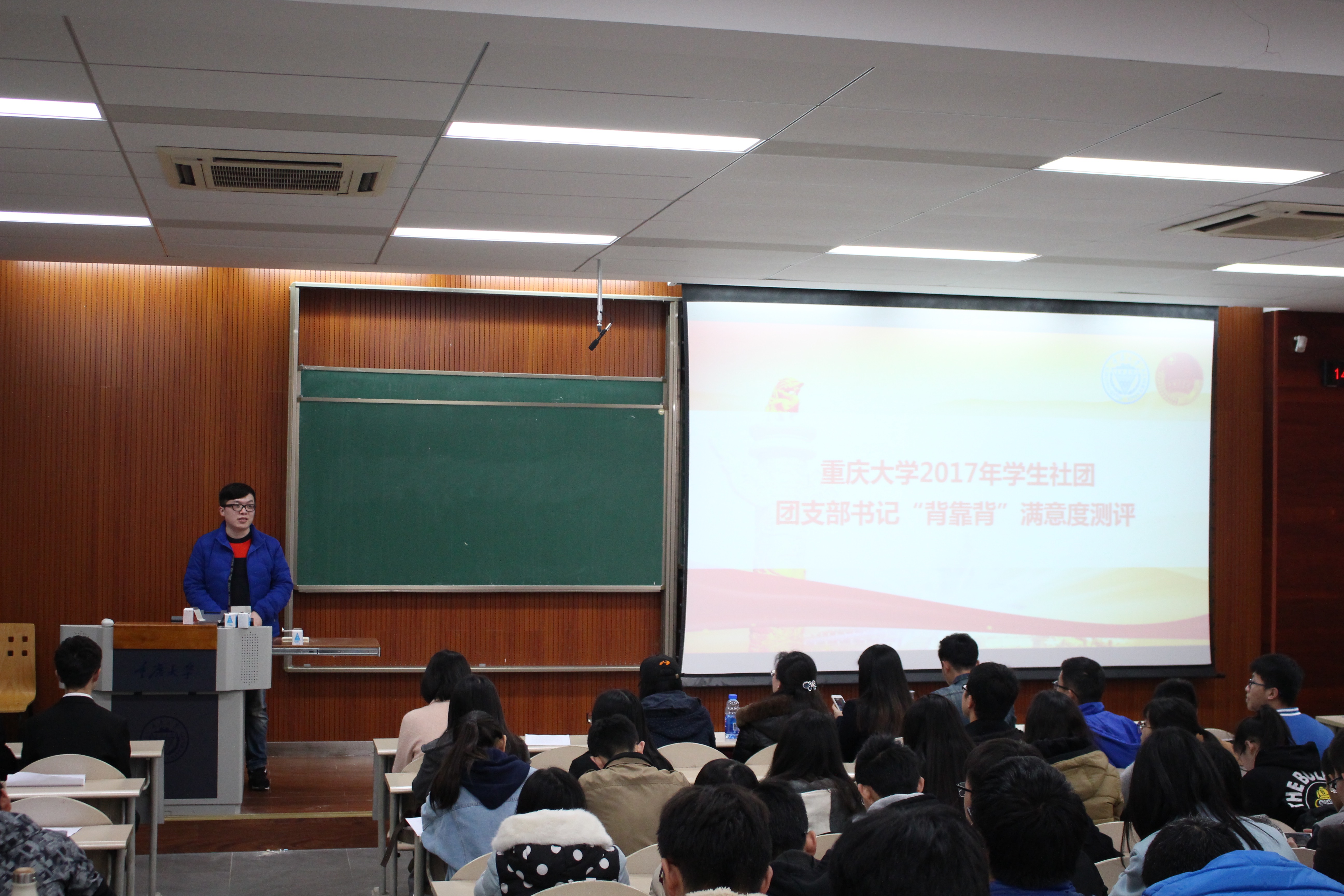 3月16日下午,重庆大学2017年学生社团团支部书记“背靠背”满意度测评在虎溪校区D1131教室启动。校团委陈洁老师,学生社团中心、学生社团联合会及各一级协会主要学生干部,校团委组织部相关负责人以及全体校级社团团支部负责人参加会议,并现场观摩了爱心社团支部书记年度“背靠背”满意度测评工作。