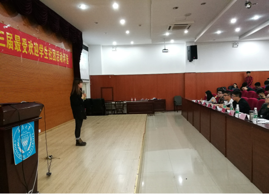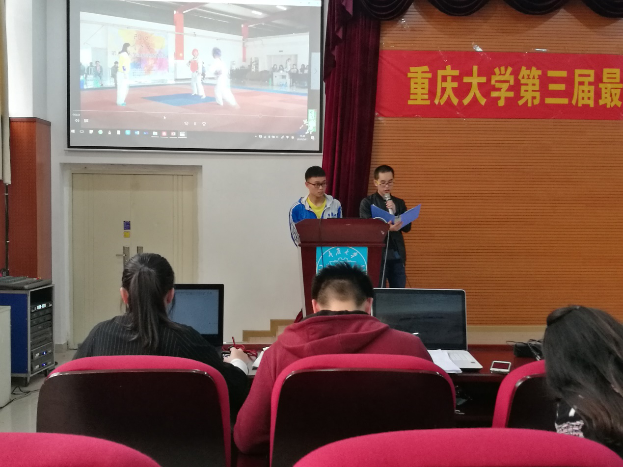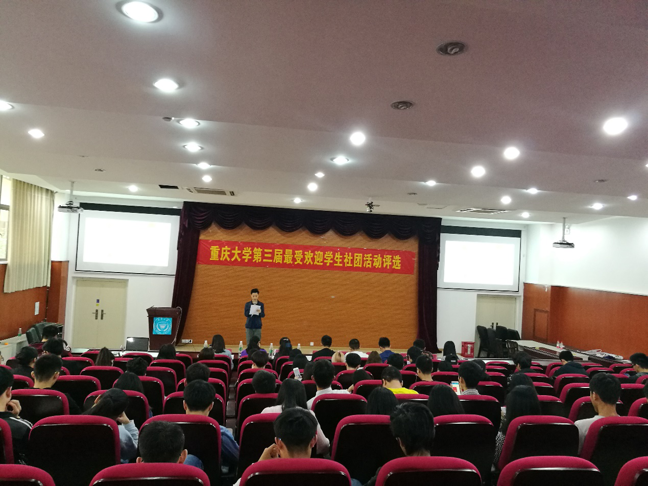 2017年5月11日下午14点30分,重庆大学第三届最受欢迎学生社团活动最终评选在虎溪校区软件学院学术报告厅顺利举行。经过上一轮的网络投票和现场投票,共有14个社团活动脱颖而出进入本轮答辩环节,社团将通过视频展示以及现场答辩的方式展开角逐。化学化工学院团委书记何巧艺老师、软件学院团委书记商金艳老师、学生社团中心主任陈洁老师以及校学生会、学生社团联合会等学生组织主要学生干部担任本次答辩的评委。