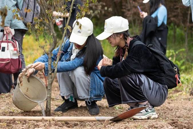 3月12日下午14时许,在重庆市沙坪坝区凤凰镇南杨苗木基地,同学们认真学习了由苗木基地工作人员组织的植树培训后,纷纷挥锹铲土、填入树坑、堆起围堰、提桶浇水,一派热火朝天的劳动景象。
