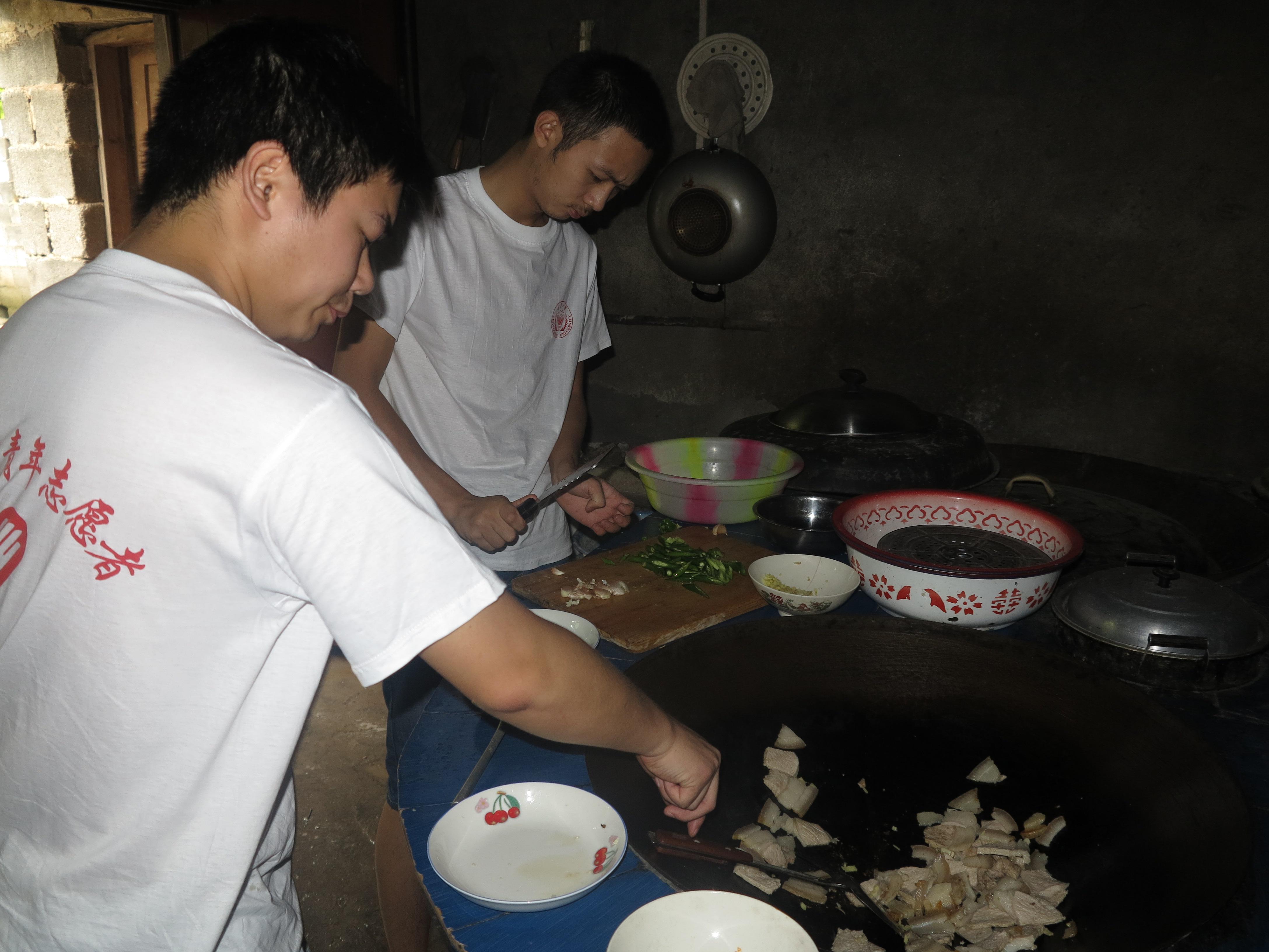 中午,志愿者用自带的食材为当地的父老乡亲们准备饭菜,为当地的家庭献上亲手制作的一份爱心午餐,大家吃地其乐融融。