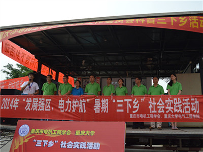2014年7月9日上午,由重庆市电机工程学会、永川区科协联合主办,重庆大学电气工程学院、国网重庆市电力公司永川供电分公司、重庆市电机工程学会科普工作委员会、永川区松溉镇科协、重庆市电力行业协会共同承办的2014年“发展强区,电气护航”暑期“三下乡”特色社会实践活动在永川区松溉古镇进行。永川区松溉镇镇长邓和平、永川区科协副主席曾垂云、重庆市电机工程学会副秘书长杨静、重庆大学电气工程学院党委副书记李成祥、电气工程学院团委书记喻惠、重庆市电机工程学会重庆大学学生分会指导老师夏鸣风以及其它单位的相关领导出席了活动的开幕式。