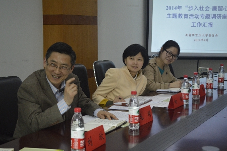 2014年4月9日下午,“步入社会×廉留心中”主题教育活动专题调研座谈会在重庆大学团委A17会议室成功举行。参加本次座谈会的有重庆团市委纪检组组长、党组成员直属机关党委书记毛羽、重庆团市委直属机关党委副书记、直属机关纪委书记向倩、重庆大学团委书记陈科、团委副书记刘庆庆,以及重庆大学青春倡廉学社的成员、学院的部分学生代表、学生干部代表。