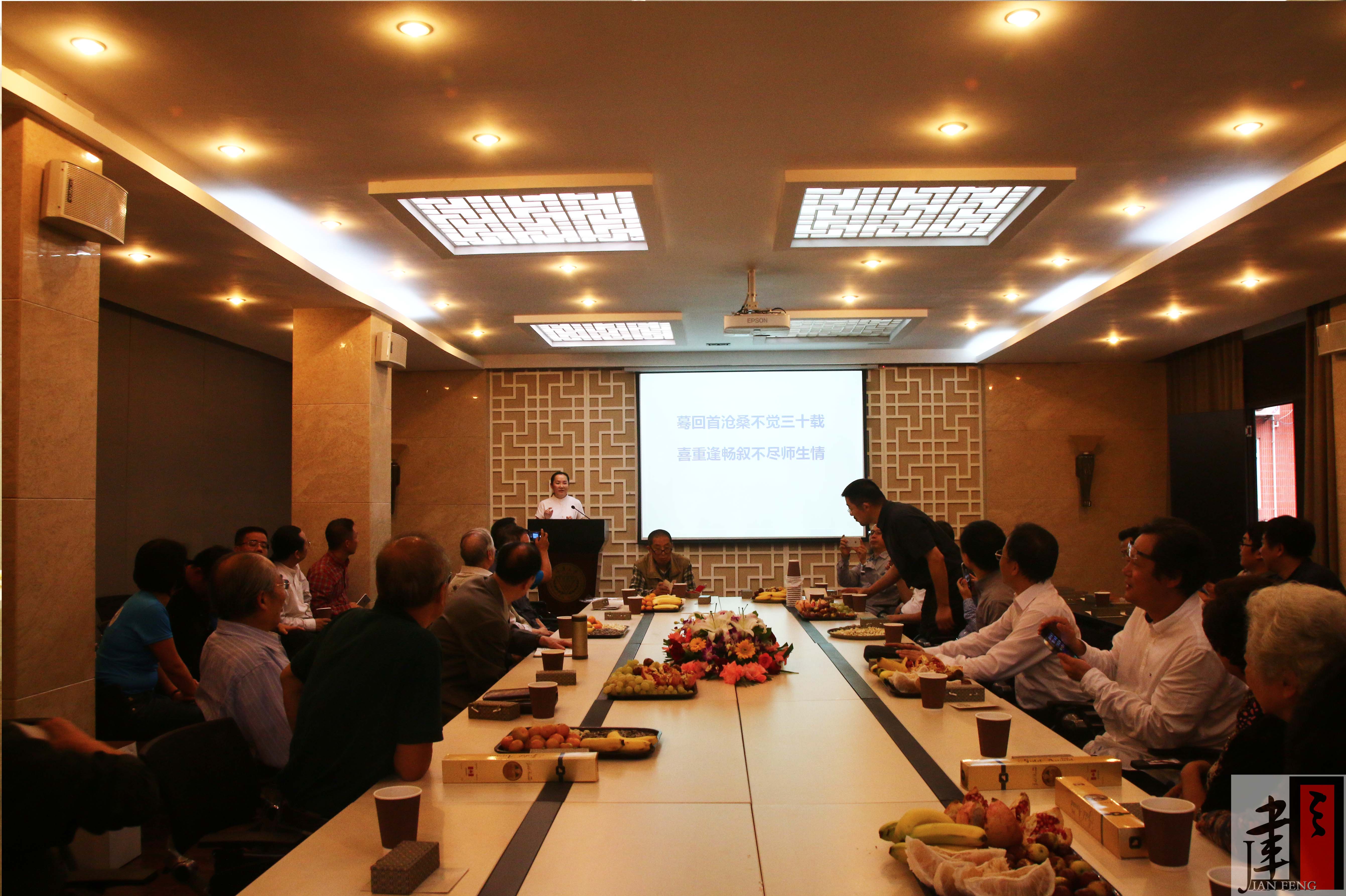 本次同学会由建八一级的王晓和校友等若干前辈组织,他早早来到会场精心进行一系列准备工作,特别为本次参加同学会的每位老师同学都准备了一方制作精美的姓名章作为纪念品。其他先到的建八一级校友与老一辈老师见面都感到甚为亲切,相互握手,多年不见再叙往事,大家感慨颇多。随着越来越多校友、老师陆续到场,会场气氛逐渐活跃、热烈起来。