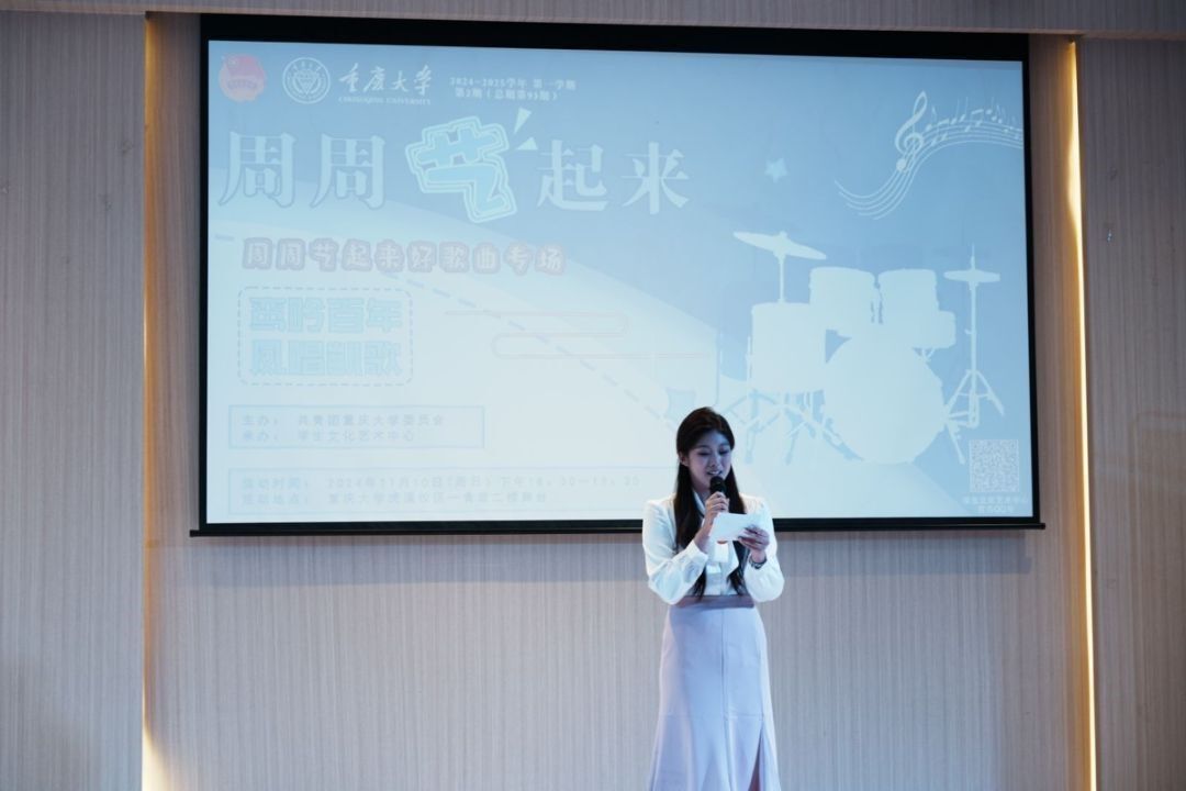 为激发更多青年学子对音乐的热爱和追求,同时给我校热爱音乐的学子提供一个展示自我的舞台,鼓励并支持他们在音乐领域深入发展,由校团委主办,学生文化艺术中心承办的“鸾吟百年,凤唱凯歌”——2024-2025学年第一学期“周周艺起来”活动第二期(总第93期)于2024年11月10日下午在虎溪校区一食堂二楼舞台区顺利举办。