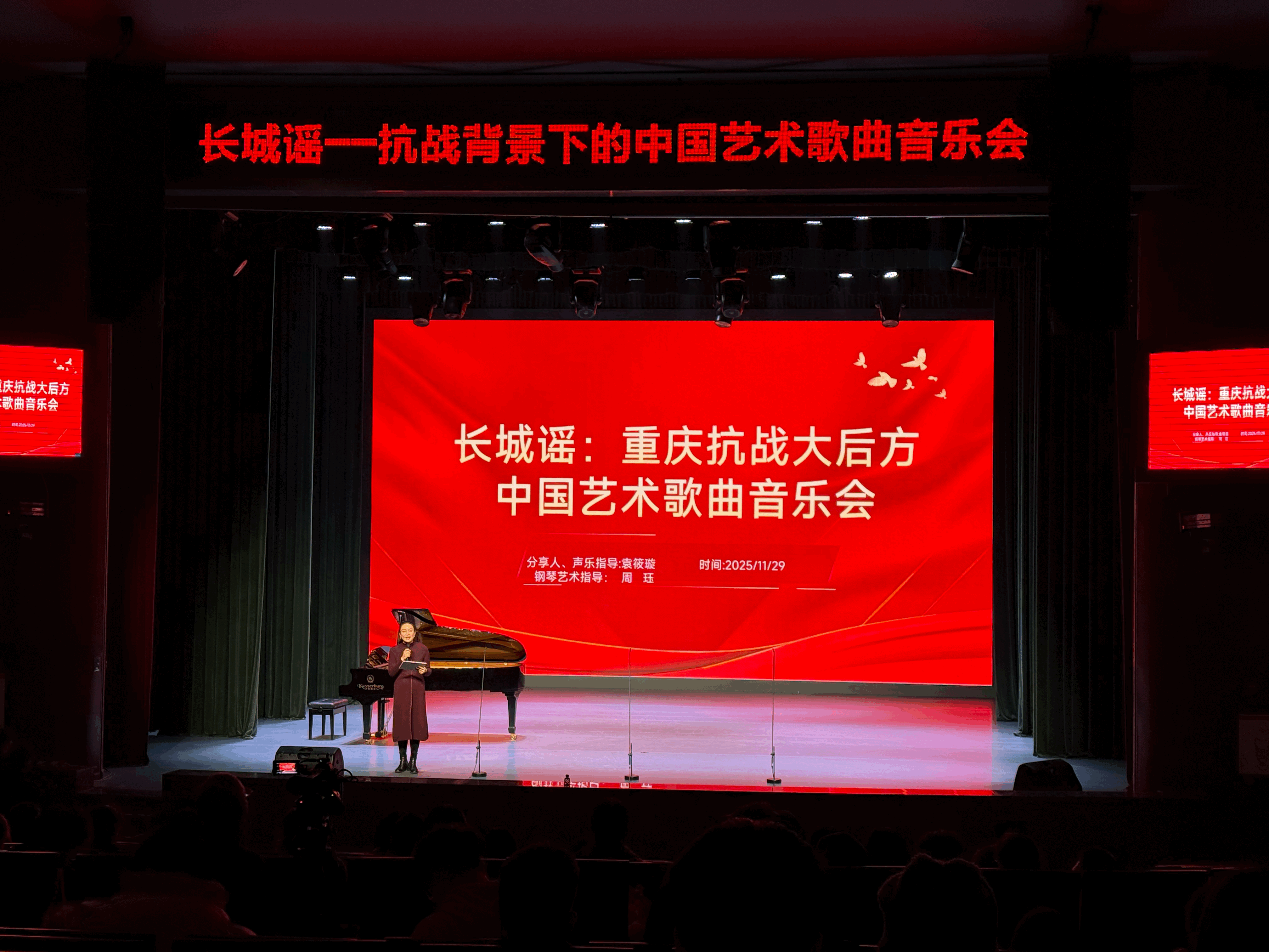 为纪念抗日战争暨世界反法西斯战争胜利80周年,弘扬伟大抗战精神,厚植师生爱国主义情怀,重庆大学2025-2026学年秋季团校青文班、青艺班课程:“长城谣”——抗战大后方的中国艺术歌曲音乐会于2025年11月29日在重庆大学科学城校区虎溪校园小剧场举行。