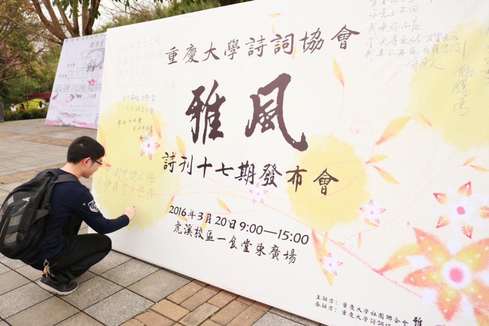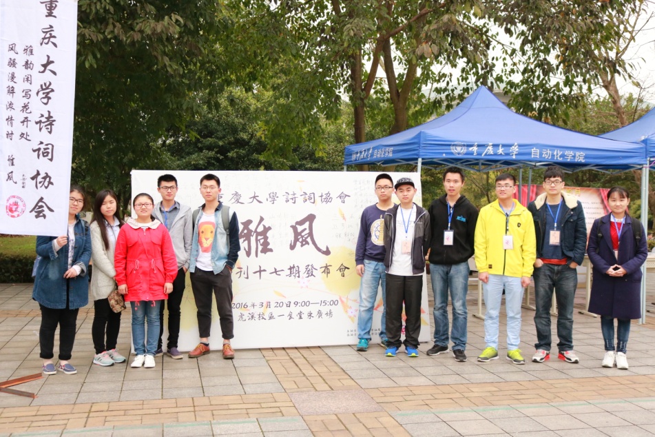 2016年3月20日,由重庆大学学生社团联合会主办、重庆大学诗词协会承办的《雅风》诗刊第十七期发布会在虎溪校区一食堂东广场成功举办。