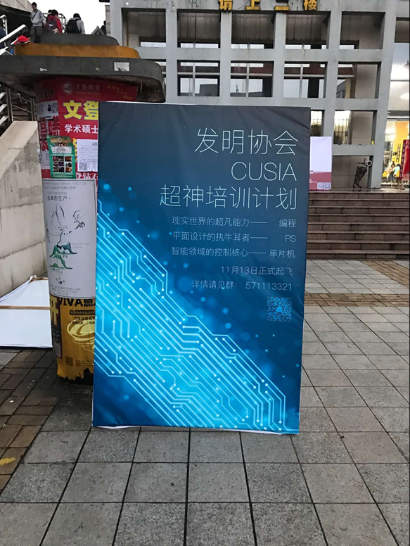 在本次活动开始前三天,由副社长张轩诚制作的活动宣传展板已经摆放在一食堂东广场,以期让更多同学知道此次活动,参与这项培训。