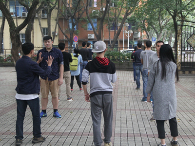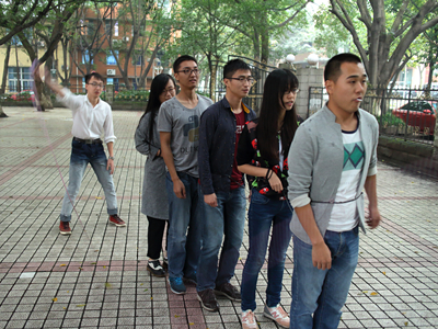 在主持人的组织下,到场成员经过报数分成四组。四行队伍依次排开,活动就正式展开了。首先是热身活动:“心有灵犀球”。如何让同组成员更快熟悉彼此,幽默的外号或许是不错的选择。大家围成一圈,依次拿着喇叭向其他组员“咆哮”自己的外号,“帅鱼”、“狗洞”、“单反哥”……大家时不时交头接耳,询问记不清楚的外号。如何证明同学们是否认真记下了外号,就用扔球来考验吧!喊出外号,将球扔给对的人,接住属于自己外号的球,才能避免惩罚。经过两轮示范,大家很快进入了状态。速度不断加快,场面越发激烈,不时有“笨蛋”遭受惩罚,欢声笑语,其乐融融。