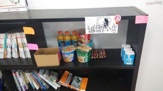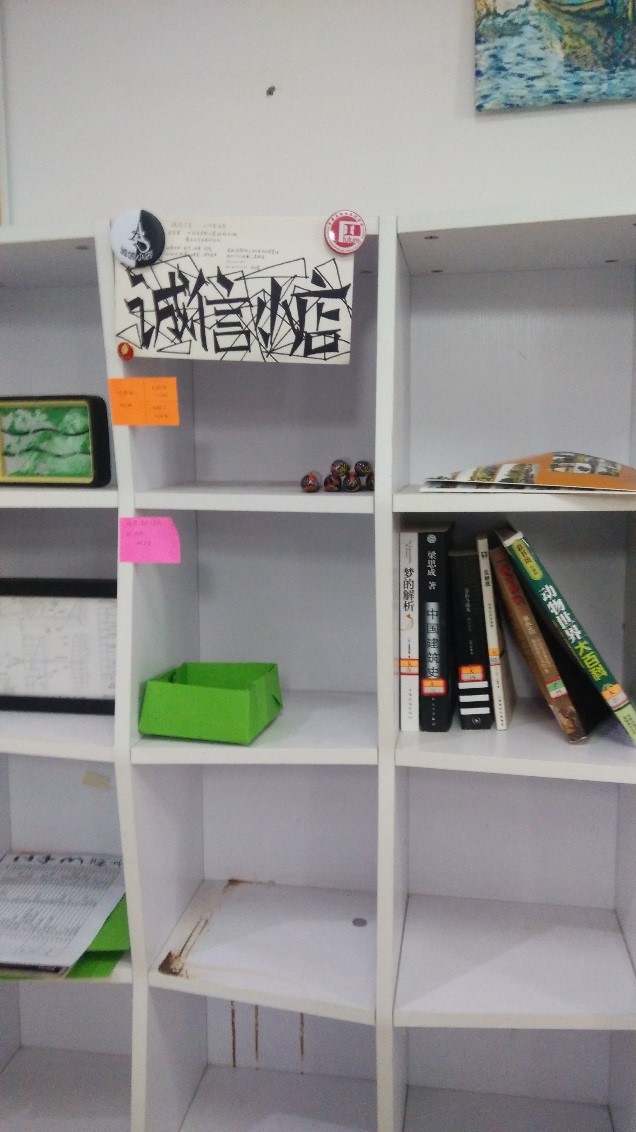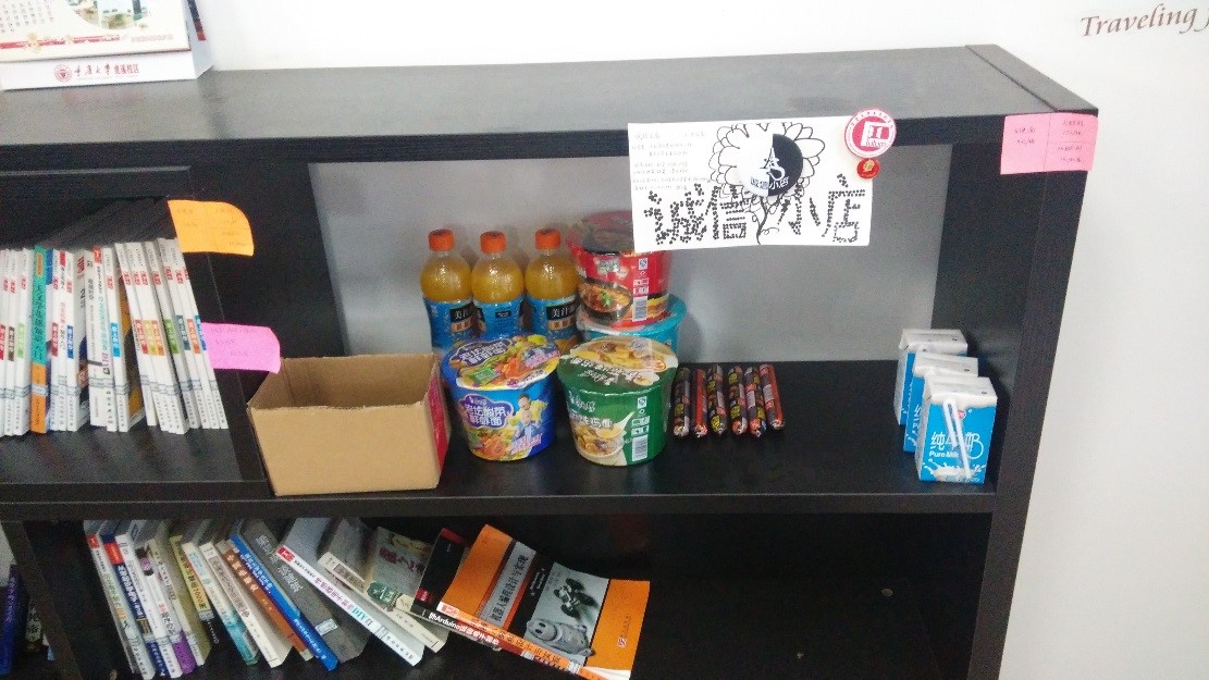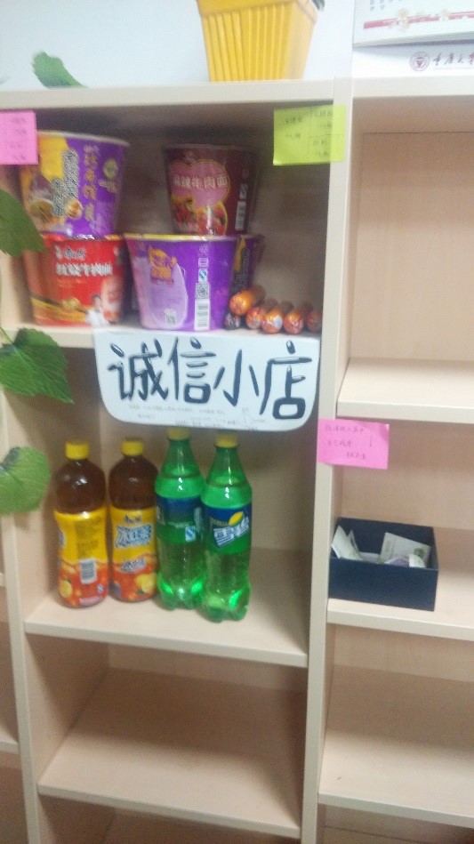 “诚信小店”项目从三月初开办到现在,已经遍布重庆大学虎溪校区的松园一栋、松园二栋、松园三栋、松园五栋。每一栋都有至少两家分店,分布在每一层的活动室书架格子上。