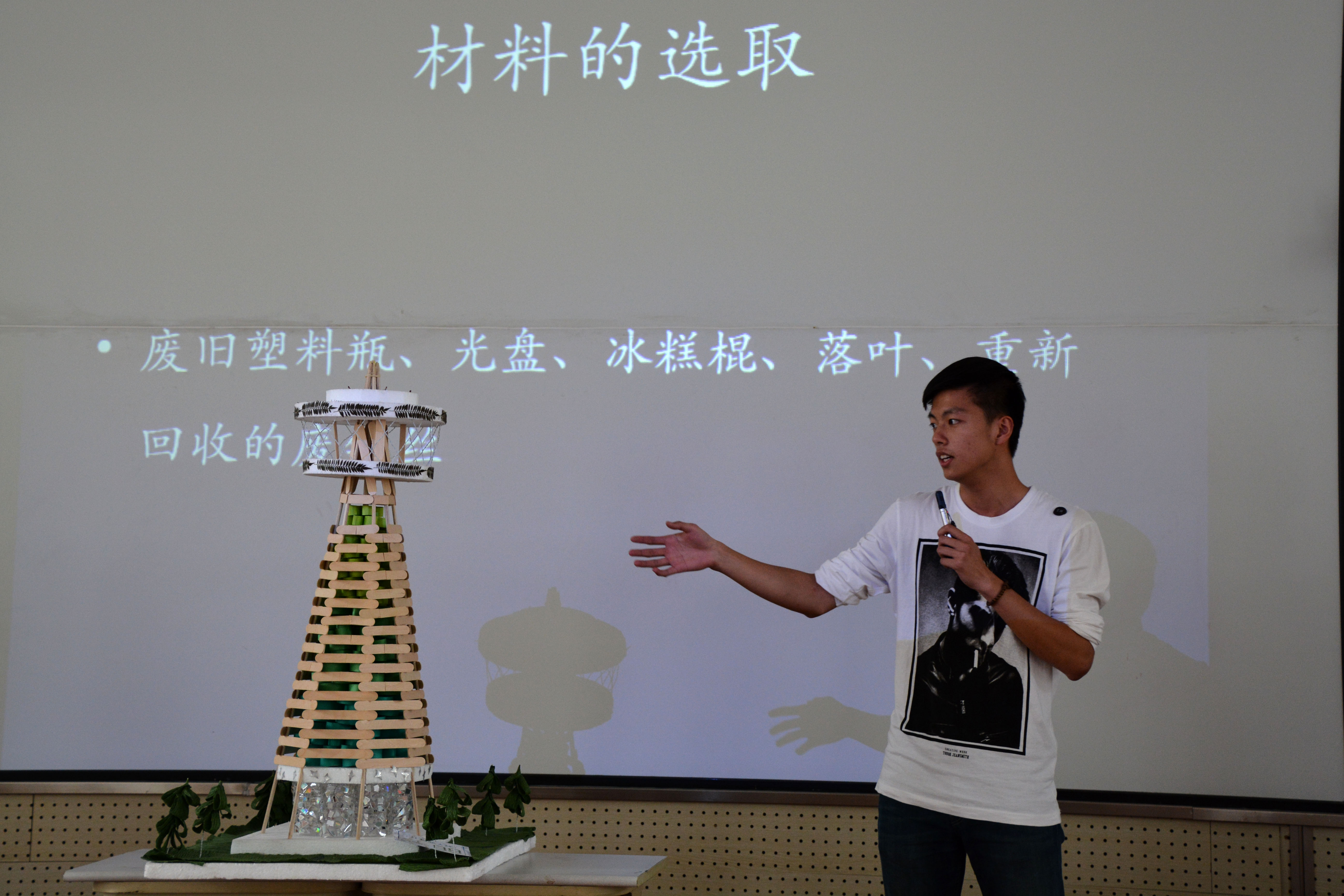 现场评审进行到后半段,好作品愈发地层出不穷,让人惊喜连连。九号队伍星尘的建筑模型“Legendary”就其设计理念让人眼前一亮。他们对建筑提出了全新的思考和定义:“商业、写字楼、住宅为何不能在一起?住宅外的风景为何一成不变?建筑为什么不能飞呢?建筑为何不能自己发电?”为此他们设计出了集多功能于一身、可以旋转甚至起飞满足人们的精神享受、靠自身风力发电的新概念大楼,为同学们的想象空间打开了一扇新的窗子。此外,选手们还妙吐莲花,金句不穷:“城市让生活更美好、科技让城市更动人。”“可以自由地呼吸,这不是对未来最浪漫的承诺吗?”“我们没有花一分钱,但我们花的是时间。”所有选手们的用心和努力,无不让人动容。