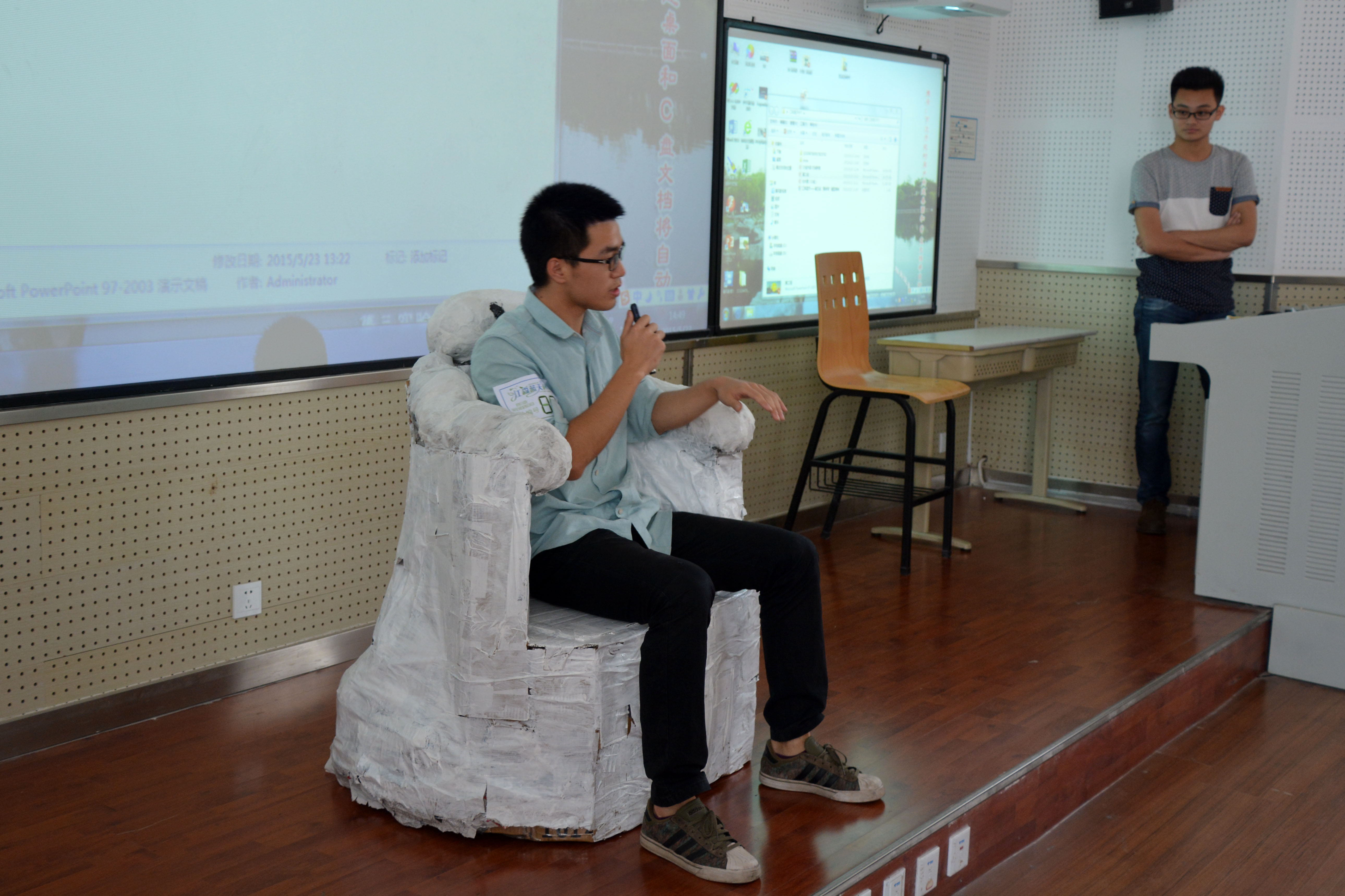 在主持人介绍完评比标准后,选手们的展示环节正式开始。GT作为第一支队伍上场,向同学们展示了自己团队设计的环保智能概念车——“智能战斧”。该模型具有绿色环保、智能化、智能变身、智能按摩座椅等特点,符合未来人们环保与舒适并存的需求,得到了评委们的称赞。二号队伍5人月饼设计的“大白沙发”,以其特有的“萌态”博得了现场的一笑。选手从作品的基础结构和制作流程谈起,提出了家居智能化和生活新鲜化的理念,致力于打造一种人机交互式体验。在点评环节,评委就产品使用、结构原理、外观设计等方面与选手进行了交流和探讨。