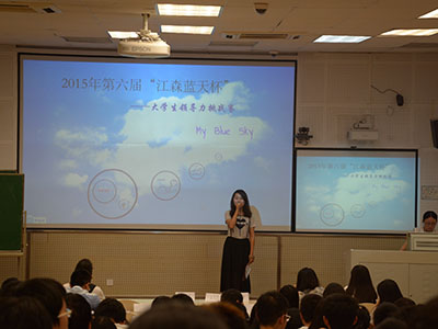 宣讲会共分为四个部分:介绍大赛的基本情况、回顾往届的精彩瞬间、解说赛制和提供信息渠道。在第一部分,主持人贺凡铭首先介绍说:“重庆大学第六届“江森蓝天杯”大学生领导力挑战赛现已成功举办五届,旨在通过一系列高质量、高要求的团队挑战,锻炼当代大学生的领导力,培养其社会责任意识,每届受益学生近千人。”第六届的“江森蓝天杯”将以“APEC蓝”及柴静“穹顶之下”雾霾调查两个话题为切入点、以“穹顶之下,探秘蓝天”为口号,引发大学生对环境问题的关注,并引导同学们走出宿舍、走出教室,感知世界之美。