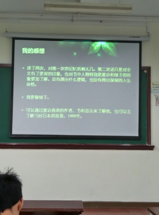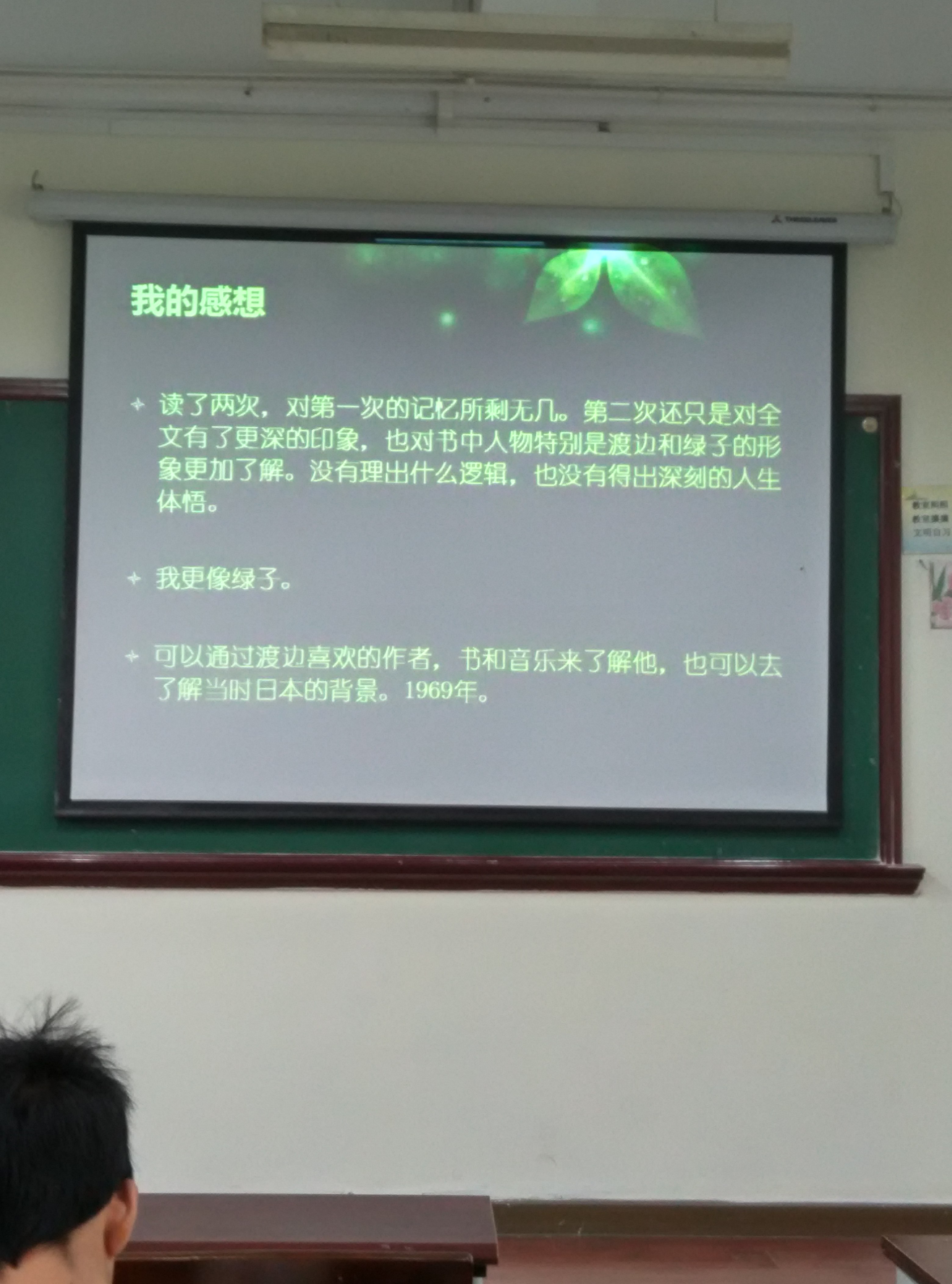 在披头士的音乐中,社团14级社员罗文婷首先登台开始分享。在对小说标题来源进行解读后,紧接着梳理了主要人物及其关系,然后分析了小说的风格,最后提出了她自己的观点。她在小说中的人物绿子身上找到了自己的影子,跳脱,直肠子,极极端又不易放手是她们的共同特点。她通过渡边与他人的对话了解渡边,还提出了通过看渡边喜欢的书,听渡边喜欢的音乐来了解渡边的方法,给大家做了一个极好的示范。罗文婷讲演完毕之后,社团14级社员罗旭鑫补充介绍了小说发生的背景——日本学潮时期。他绘声绘色地为大家介绍了泷川事件,浅田山庄事件,以及日本赤军的故事,开拓了大家的视野。在他之后,社团13届社员夏季就小说中的阿美寮疗养院发表了自己的观点,分析了永泽的消极虚度和玲子的积极虚度,最后提出“如果有上帝,他一定是孤独的”的命题,阐释了小生态不能脱离大生态独立生存的观点。在他之后,整个分享的最大亮点终于浮出水面,分享会主持人,14级社员凭借自己丰富的经历,有理有据,感情充沛地分享了自己的观点。他讲了很多。提出了羁绊的新概念,每个人的一生都需要羁绊,家人是羁绊,朋友是羁绊,但这种羁绊是一种难得的福气,人与人之间,人与事之间由不同的弦联系起来,不要像玲子和直子那样一条弦断了就不知所措,死的人肉体虽死,我们却还在为他而活。所以他在这本书中一页的空白处写上了don’t rely on one thing too much这句话,来记录他对这本书的理解。来自于经济学专业的他活学活用,还提出了“引力效应”和“经济人”的概念辅助阐释了自己的观点,大大提高了观点的深度。在谢缙的讲演后,活动圆满谢幕。