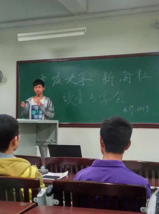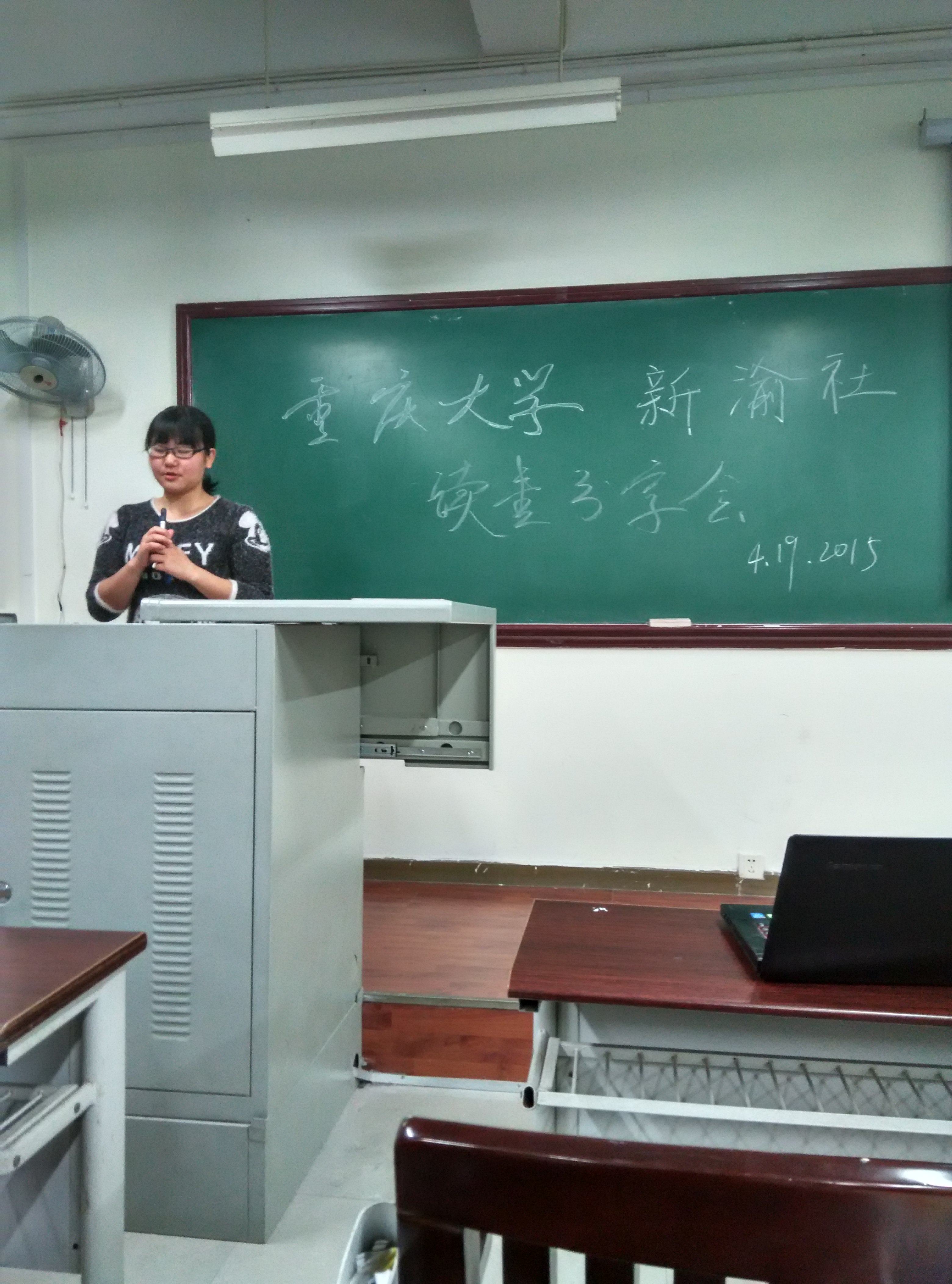 北京时间2015年4月19日晚七点,重庆大学新渝社在D1223在14级社员谢缙的主持下以小说《挪威的森林》为主题召开了本学年的第三次读书分享会。