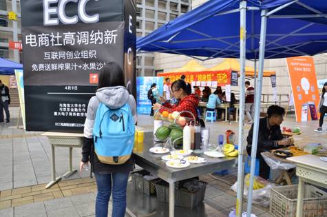 本次活动旨在宣传ECC,尽可能让每一个经过活动现场的人能够对ECC产生兴趣,让大家都了解到ECC这个新社团的存在。通过活动前和京东金融的谈判,我们社团成功获得了他们提供的1500元的赞助费,用心制作了专属于ECC的杯子和盘子,分别用来装鲜榨果汁和水果沙拉,另外购买了多种水果进行现场制作,通过美食吸引大家的眼球,进而使大家产生对于ECC的兴趣,关注ECC的纳新。活动期间,路过活动现场的同学只需要拍一张ECC展板的照片发说说或朋友圈帮助ECC进行纳新宣传,即可免费领取一份鲜榨果汁或水果沙拉,活动进行到最后,水果已基本送完,有78人报名成为内部成员,18人报名成为会员,粉丝群人数两天内激增到98,活动取得圆满成功。