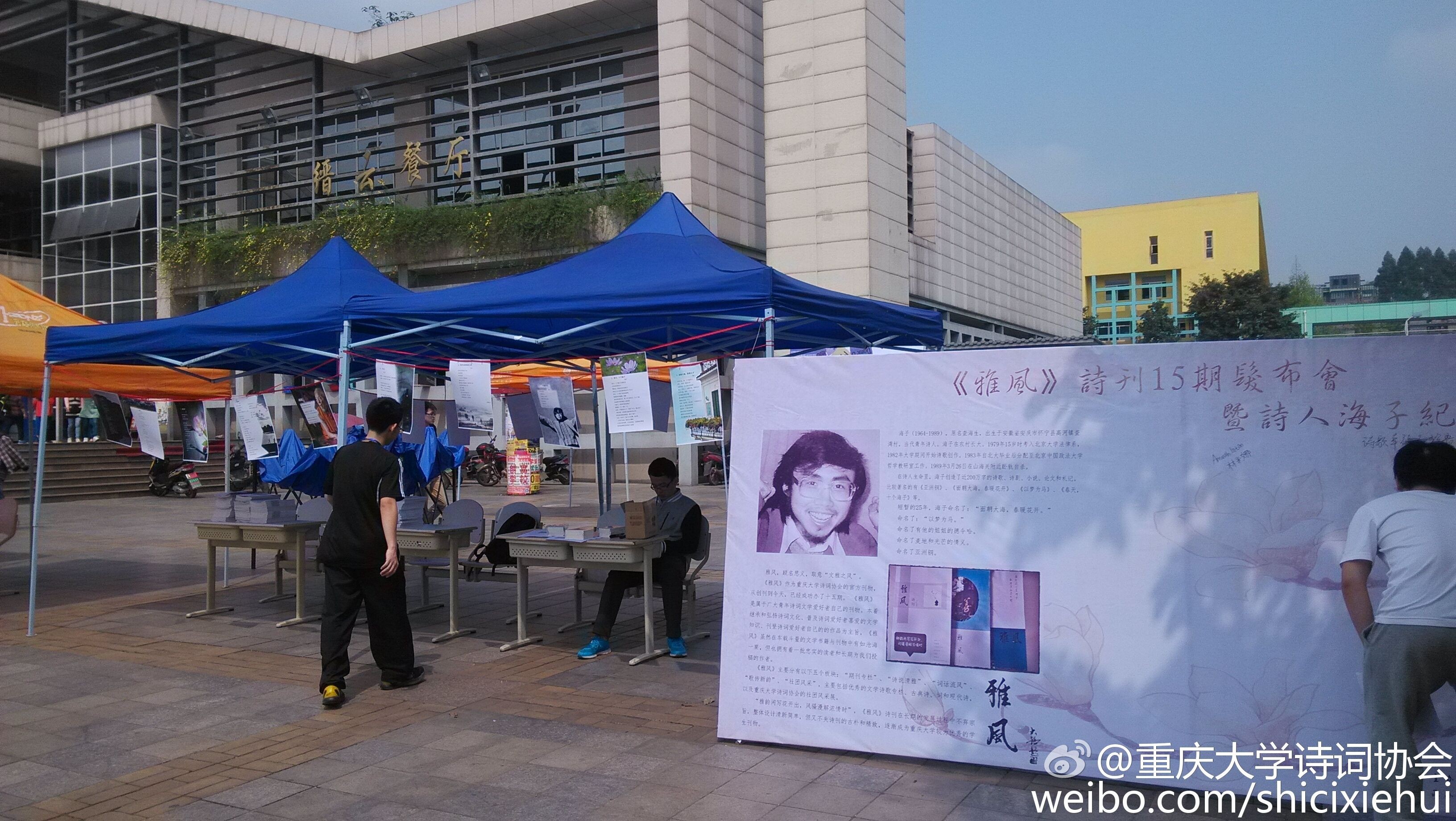 2015年3月26日,由重庆大学学生社团联合会主办、重庆大学诗词协会承办的《雅风》诗刊第十五期发布会暨诗人海子纪念活动,在虎溪校区成功举办。1989年3月26日,曾写下“面朝大海,春暖花开”的那位要做一位幸福的人的诗人,卧轨自杀了,但海子之魂却与世长存。诗词协会的成员们与所有同学在今日一起纪念海子,一起感受海子的诗和海子的心。在感受海子的诗的同时,得到心灵的洗涤。