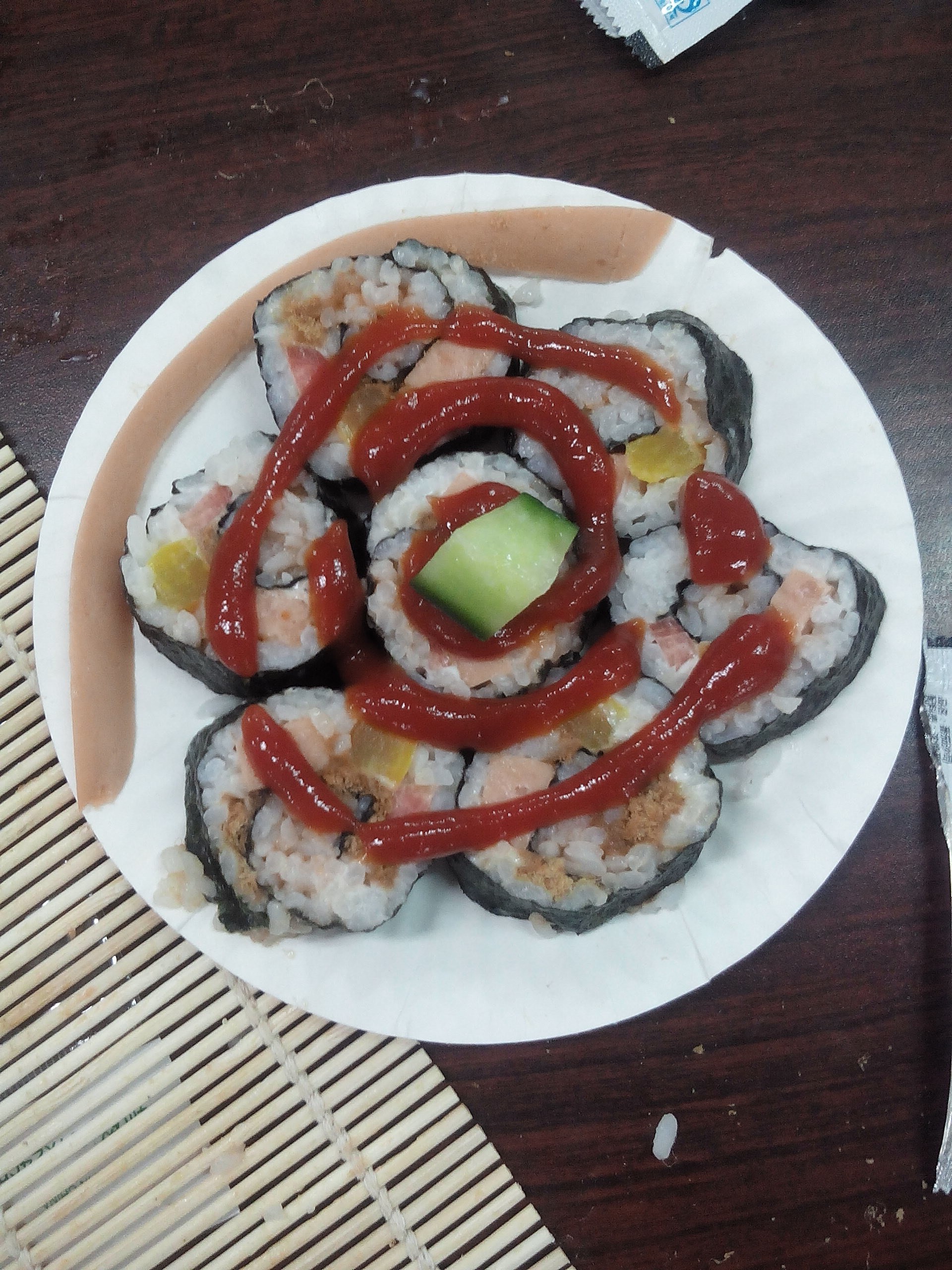 下午一点钟,工作人员提前到教室布置场地,装饰圣诞树,贴彩带,吹气球,准备做寿司的食材,大家忙得不亦乐乎。到了三点钟,活动正式开始。主持人先进行开场白,宣布活动的开始。小伙伴们根据牵线确定分组,两人一组,接下来的活动要以小组比赛的形式进行。第一环节是做寿司,小伙伴们在齐景怡的指导下,合作做寿司。经过热闹的讨论交流,大家的寿司陆陆续续都做好了。