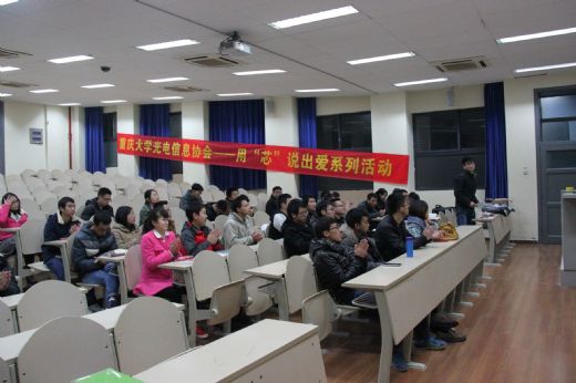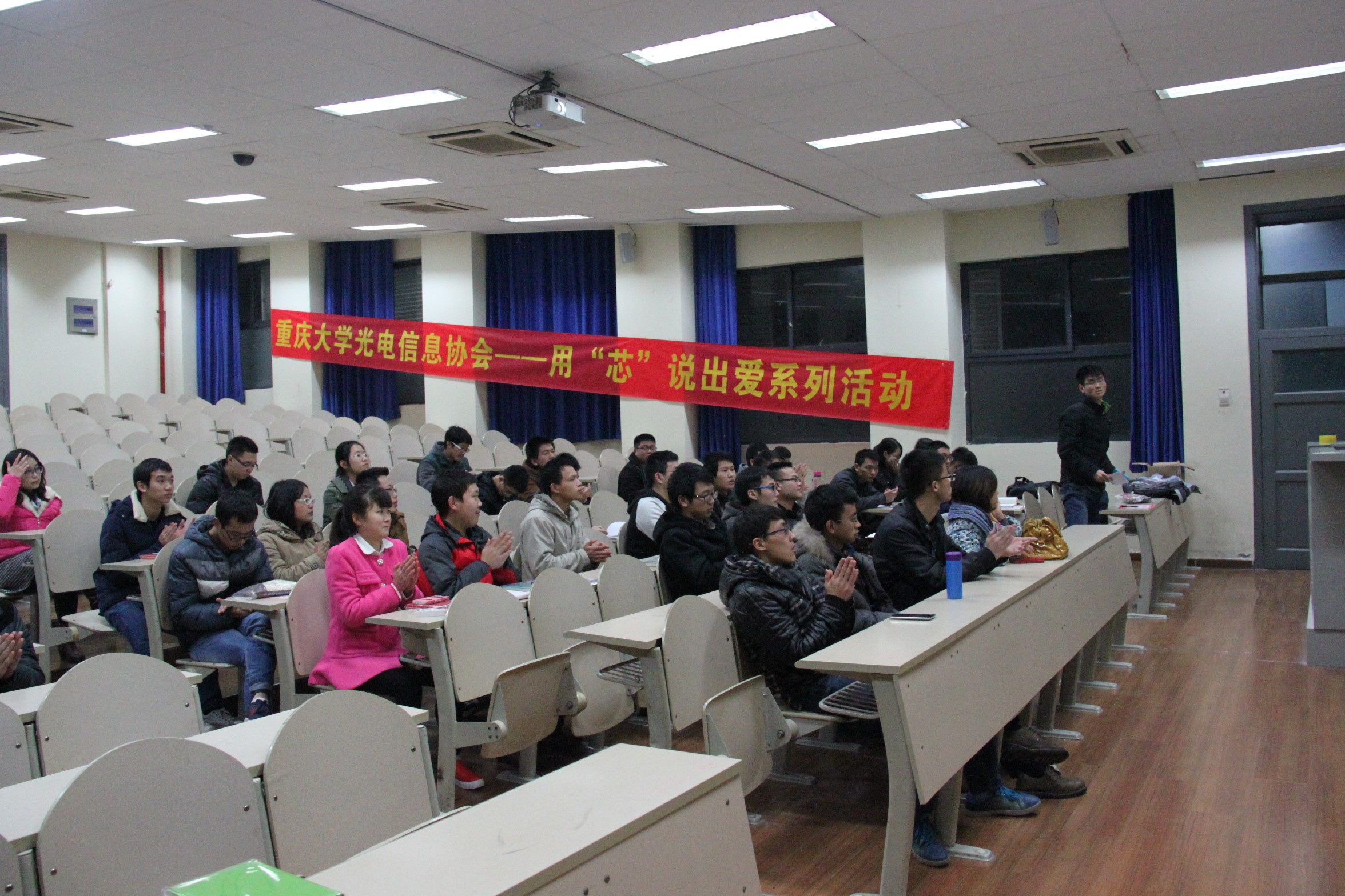 2015年1月5日晚8:00点,重庆大学光电信息协会2014年工作总结会议暨重庆大学第一届光电设计大赛(用“芯”说出爱主题)颁奖仪式在D1131顺利开展。本次会议由重庆大学光电信息协会副会长张帅磊主持,协会指导老师李敏、会长孙学龙以及协会各个部门的成员参加了此次会议。