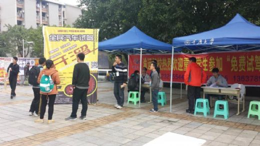汽车爱好者协会是重庆大学2006年成立的校级社团,本次活动在全校范围提前做足了宣传。我们首先在全校宿舍楼下张贴了海报以及在一食堂广场放置大型展板并进行了现场报名。吸引了一大批同学驻足观看,我们的社员也积极详细地给同学们介绍我们试驾活动的情况,引起了同学们对汽车极大的兴趣,报名人数迅速增加。活动当天下午两点半,在社团成员的带领下,同学们乘坐驾校汽车前往驾校场地。到达场地后,同学们被分成4人一组,每组由一名教练带领讲解汽车驾驶知识,之后在教练的指导下轮流进行了两个多小时的汽车驾驶。试驾结束后,同学们都收到了一本驾校赠送的《汽车学习驾驶员培训教材》和我们社团准备的精美礼品,之后统一在社团成员的带领下乘坐驾校汽车高兴地返回学校,全民汽车试驾活动圆满结束。
