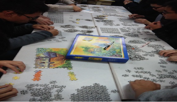 结束了爆笑的前半场,马上又迎来了激动人心的后半场的“拼图我最快”环节,随着主持人一声令下,各小组也立马忙起来。一改之前的热闹非凡,现场忽然变得鸦雀无声。各小组都不约而同地从背面的字母拼起,首先聚精会神地给字母分类。时钟走了半小时后,字母已基本分类完毕。比赛也进入了白热化阶段,各小组都已开始聚精会神地拼凑图案了。由于看了太多字母,视觉开始出现疲劳,小伙伴们开始头晕目眩,眼花缭乱起来。但是拼图却也没有丝毫懈怠。