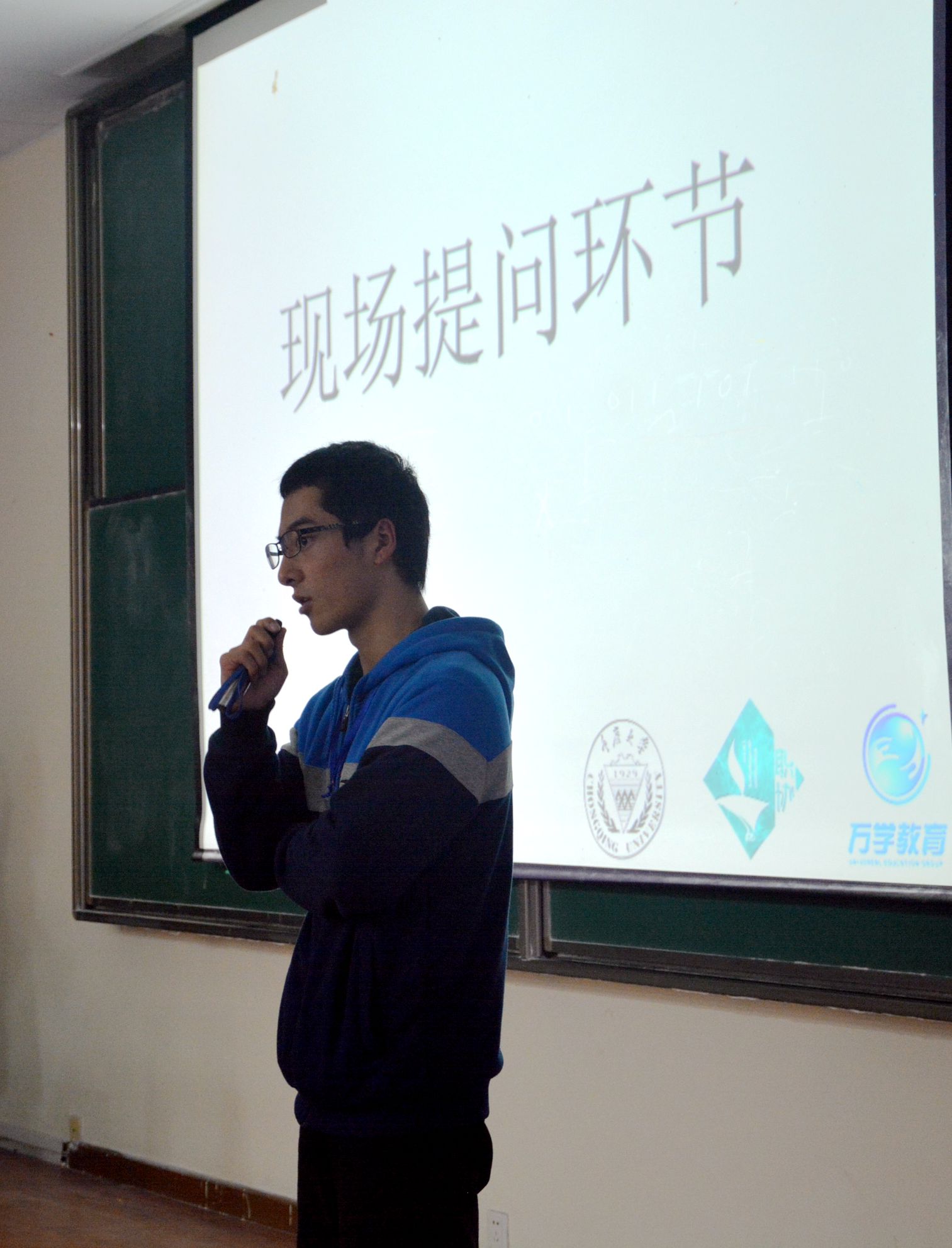 接下来为观众现场提问,在此过程中,同学们都对自己还较为模糊或较为关心的问题向进行答疑的工作人员进行提问:初赛的视频作品必须要求作者本人出现在镜头中吗?比赛中的评委是谁?是否具有足够的权威性?在复赛中制作PPT的时候是否可以邀请老师给予一定的帮助?而答疑的工作人员也对这些问题进行了详细的解答,并且还主动针对某些比较容易混淆的地方向观众仔细说明,以确保在座的所有观众都能对比赛有足够的了解,能够在准备充分的情况下参赛。