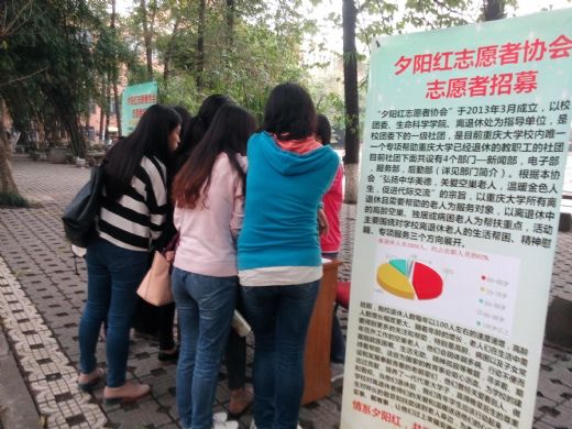 根据“弘扬中华美德,关爱空巢老人,温暖金色人生,促进代际交流”的宗旨,2014年10月21至24日,夕阳红志愿者协会分别在重庆大学A区小竹林和B区第二综合楼门口设立宣传纳新服务点,进行为期四天的纳新活动,本次活动由重庆大学社团联合会主办,并由夕阳红志愿者协会承办。
