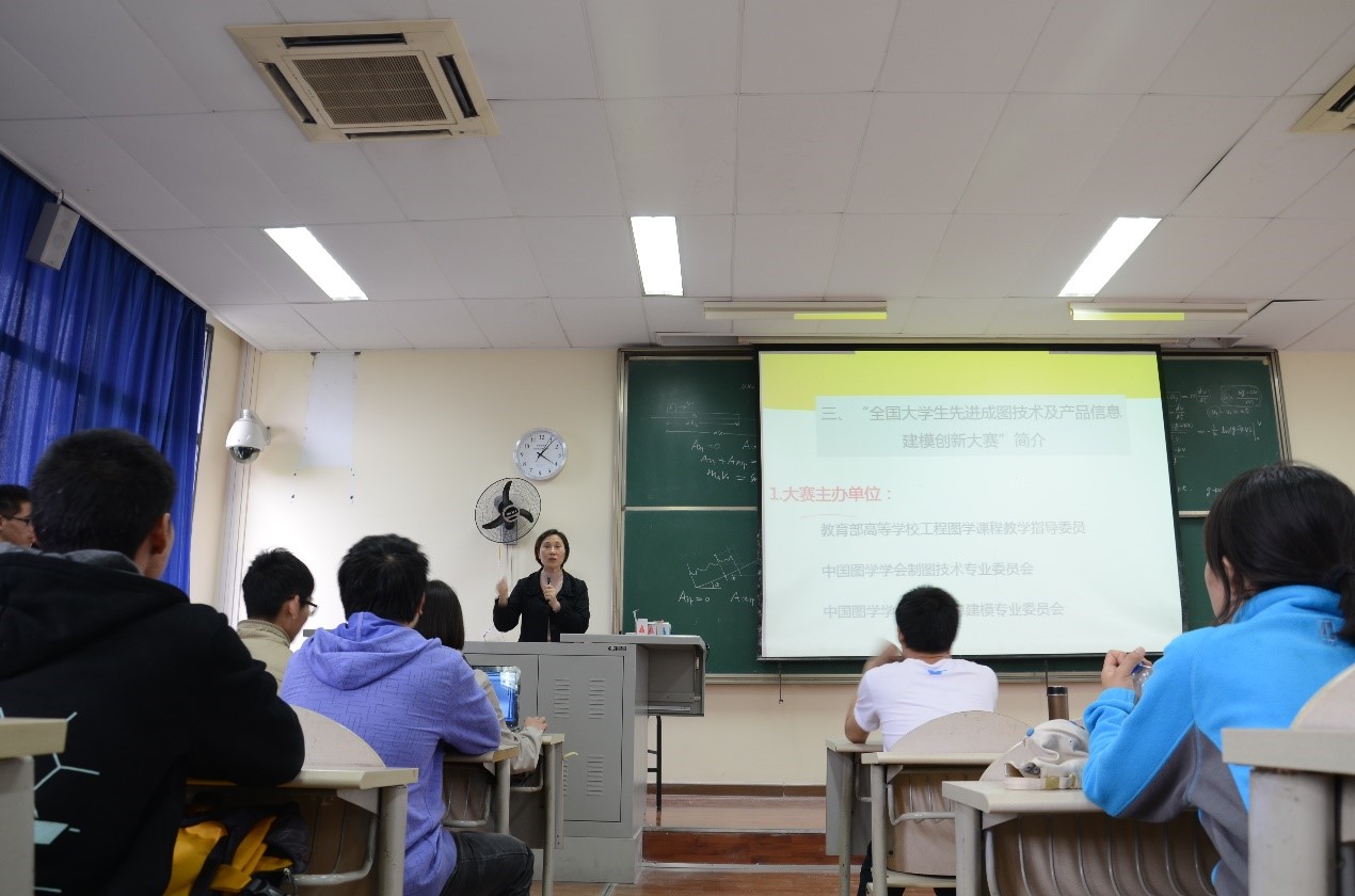 首先刘嘉慧同学详细地介绍了协会成立的背景:由教育部高等学校工程图学教学指导委员会、中国图学学会制图技术专业委员会等举行的全国大学生先进成图技术与产品信息建模创新大赛是重庆大学学生参加的一个重要大赛。竞赛内容主要为尺规绘图与计算机绘图。今年8月份,我校派出两支队伍(一队5人)参加了第七届全国大学生先进成图技术与产品信息建模创新大赛机械类竞赛。两支队伍都获得团体二等奖。在此契机下,也在机械学院制图老师的强烈建议下,由安存昌等多名参赛队员在2014年9月份通过申报、答辩、答辩通过后期准备终于成立了重庆大学机械制图协会。