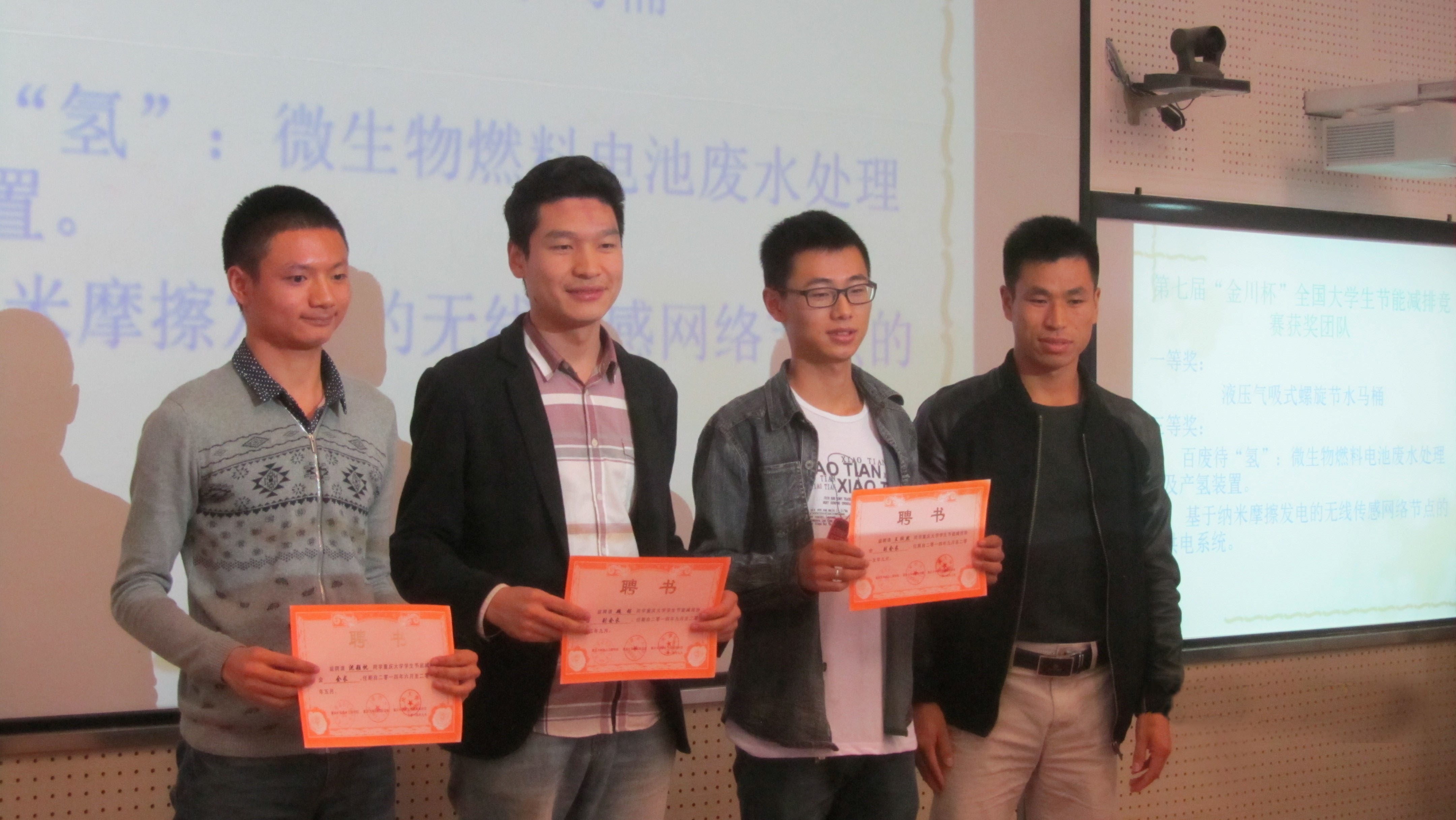 会议伊始,重庆大学动力工程学院13级辅导员何清达老师首先为三支获得节能减排大赛国家级奖项的团队进行了颁奖,之后三支获奖团队代表分别上台向13级学弟学妹简单介绍获奖作品的工作原理,并给予学弟学妹们一些中肯的建议及获奖经验。
