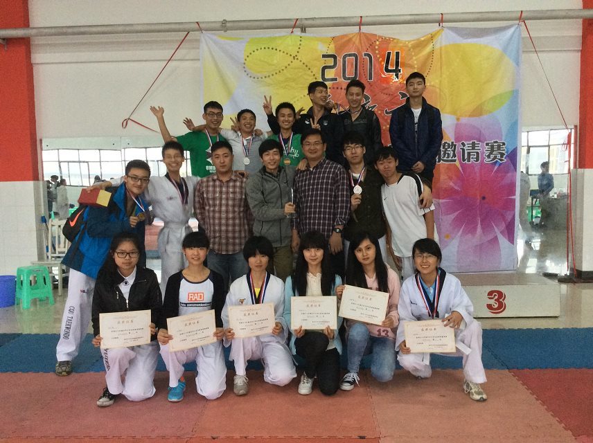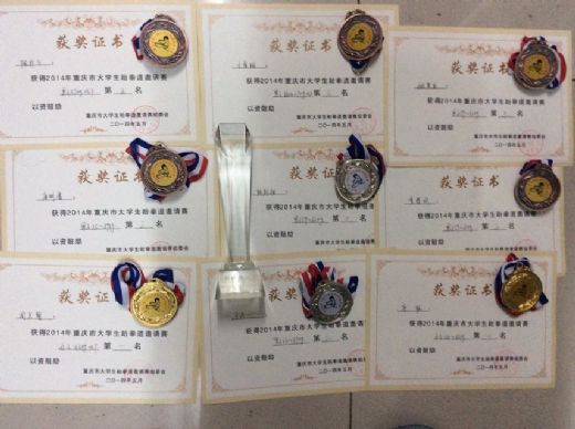 本次代表重庆大学跆拳道社团参加比赛的多为大一新生。其中,唐聪和周兰馨表现优异,勇夺金牌。王洪一,陈超祺获得银牌。李程刚,唐明清,姚贺禹,陈扩飞以及王德阳获得铜牌。虽然最后没有夺下冠军,但这已经是重庆大学跆拳道社建社以来的最好成绩。这次比赛的成绩,得益于潘先涛社长以及程世豪,唐明清两名副社长孜孜不倦的教导,当然还有社员们自身勤奋的训练。
