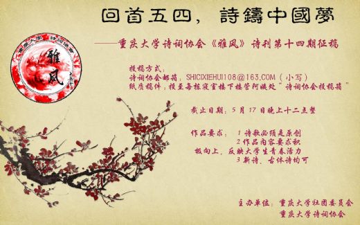 昔时五四爱国运动历经艰难而不屈,今时今日我们用文字书写壮志豪情、用诗歌颂扬五四精神。2014年5月重庆大学社团联合会携手重大诗词协会联袂打造“全国大学生诗歌邀请赛”暨《雅风》第十四期征稿活动纪念五四运动九十五周年。