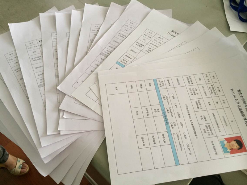 在前期的宣传以后,接下来就是Troice人声乐团纳新活动,具体为同学们通过宣传普及活动后进一步了解了阿卡贝拉,通过二维码下载报名表申请参与到阿卡贝拉中来,社团整理报名表通知报名同学在指定教室参加纳新。在面试的过程里,分别考验了面试同学的清唱展示音色,视唱练耳测试音准及音乐素养以及节奏感测试。通过了严格的筛选制度,挑选出了一部分极为优秀的同学成功加入重庆大学阿卡贝拉清唱社Troice人声乐团,参与到日常排练及演出活动中来。