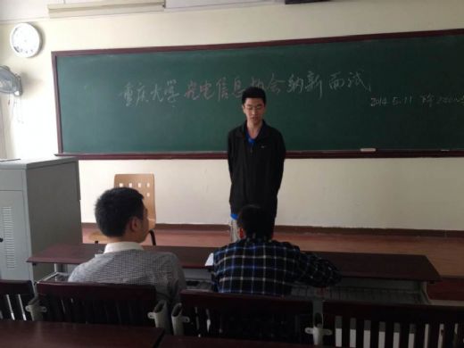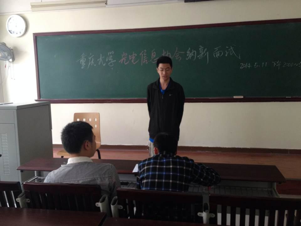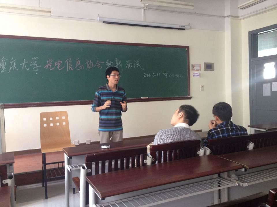 2014年5月11日下午两点,光电信息协会在D1223展开首次纳新面试活动,此次纳新吸引了来自光电学院、电气学院、机械学院三个学院,大一、大二两个年级近百位同学。本次活动由重庆大学社团联合会主办,并由光电信息协会承办。