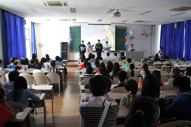 11日下午2时,在身着和服的四名主持人的宣布中,第四届日语配音大赛正式开始。此次大赛共吸引超过80位参赛选手,其中包含近40名非日语专业的同学。大赛上半场为非专业选手的比赛。来自不同学院不同年级的日语爱好者们凭借着对日语、日本动漫,以及日剧的热爱,向在场观众呈现出了不少精彩的配音表演。其中来自机械学院的李恒和新闻学院的代红柳组凭借对Angel beats的深情配音,夺得了非专业组的一等奖。之后的下半场比赛中,日语专业的选手带来了风格各异、精彩绝伦的配音表演。不同年级的学生在配音的欢乐笑声、惊叹掌声中,度过了难忘的一个下午。专业组中,来自日语专业大二的资礼琅、余晓徐、闫懿一组,凭借对视频“紧急审讯室”的倾情配音,赢得了全场的掌声,获得此次大赛专业组的一等奖。在活动接近尾声时,成娜同学一首日语歌——夕颜,为此次大赛画上了完满的句号。