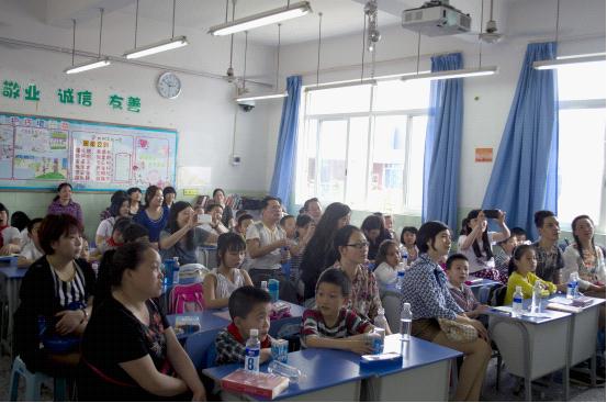 志愿者们为学生和家长仔细介绍了二十四节气的谷雨节气,同学们端坐着并积极回答问题,教室一片活跃的氛围。紧接着是游戏环节,志愿者拿出事先准备好的游戏道具分发给所有的同学,游戏的进行带来了活动的高潮,同学和家长们都格外兴奋,尤其是拿到奖品的同学更是精神奋发。