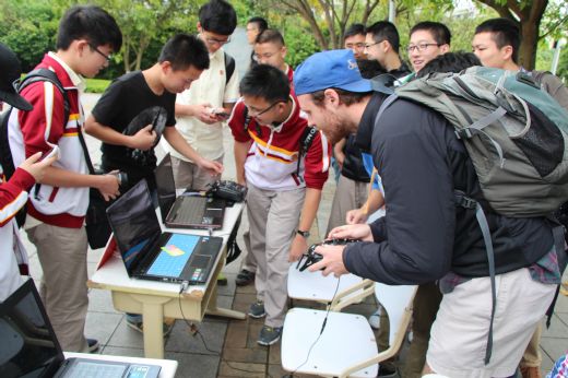 午饭过后,航展迎来了第二度火爆时期,成都七中嘉祥外国语学校的40多名高中师生在航院团委伍丹老师的带领下来到展区参加我们的活动。40多名学弟学妹们带着兴奋和好奇的眼光看着我们展出的各式航模,期间还向我们提出了许多问题,航协的同学们也一一为其解答。他们除了观看航模,还参加了我们的抽奖活动和模拟飞行体验活动。在模拟飞行体验区,有航协的学长指导学弟学妹们操控电脑里的模拟飞机,同学们学得很是认真,身边围观的同学们也激动地看着屏幕里的飞机时而上升,时而俯冲,不时发出欢呼声,好一派热闹的景象。我们在本次活动中不仅让远道而来的嘉祥同学们体验到了航模的快乐,向他们普及了航模知识,同时也展示了我们重庆大学科技社团的风采。