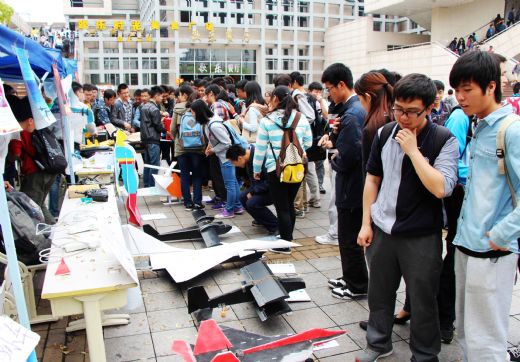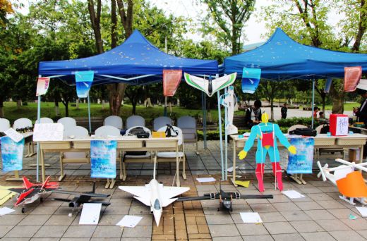 航展活动分为了五个区域,分别为航模制作工具区、自制航模投票展示区、成品航模展示区、智能小车展示区、模拟飞行体验区。在航模制作工具区,大家可以看到制作和平时航模飞行训练时用到的工具,电烙铁、钳子、各个型号样式的螺丝刀、蒙皮熨斗、电钻等工具。自制航模展示区展示了航协同学们制作的各式模型,有用KT板制作的歼十模型、超人模型、用轻木做的涵道喷气式战机模型等等,样式琳琅满目,让前来观看的人们赞不绝口。在成品模型展区展示的有航协同学们用于平日训练、飞行表演使用的成品模型,包括F3A机型、滑翔机、尽速三角翼等机型,用于航拍的有四轴飞行器、六轴飞行器。在智能小车展示区,展示了机器人爱好者协会的巡线智能车。在模拟飞行体验区,布置有几台电脑和航模遥控器,感兴趣的同学可以在此区域体验模拟飞行的乐趣。