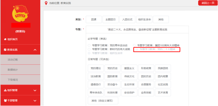 以各团支部为单位,团支书须及时将实际开展情况录入到“智慧团建”系统【教育实践】板块“党的二十大精神”必学专题,并完成前三个主题的录入。