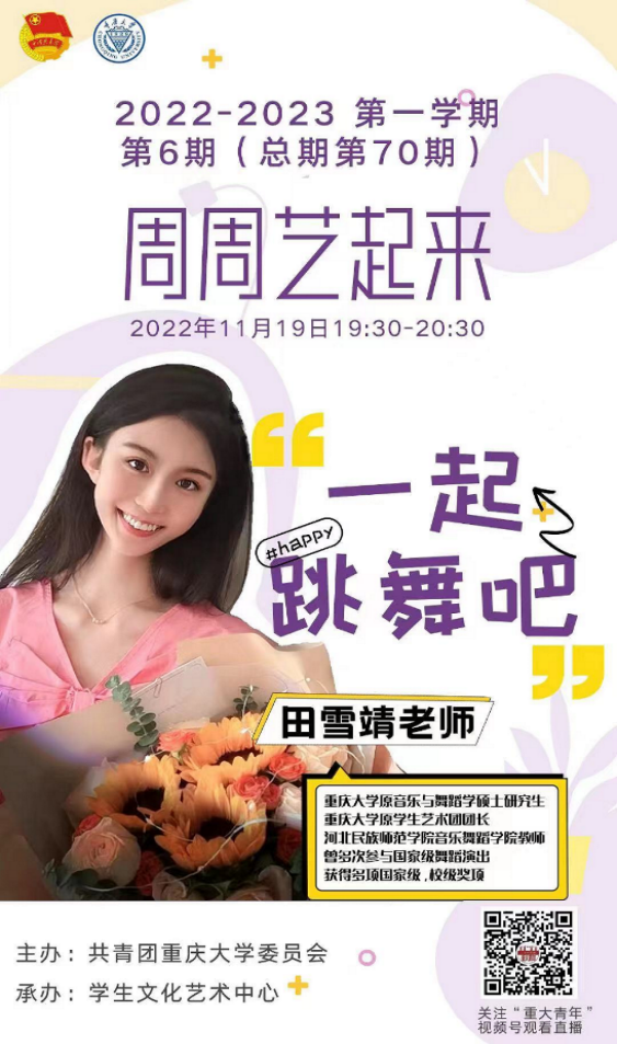 为进一步丰富校园文化生活,加强校园精神文明建设,重庆大学文化艺术中心如期举办“周周艺起来”活动第六期。本次周周艺采用线上直播的方式,邀请河北民族学院田雪靖老师带领大家学习简单的舞蹈,有助于帮助同学们愉悦身心,释放压力,调整状态。