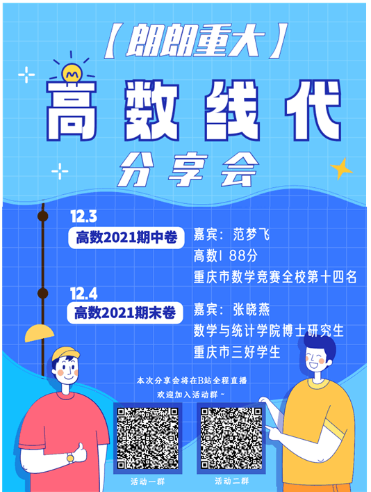 在期末考试周临近之际,为缓解同学们的高数线代复习压力,帮助同学们更好巩固数学知识、学习解题技巧,由重庆大学学生会主办的朗朗重大高数线代复习分享会将于11、12月开展。