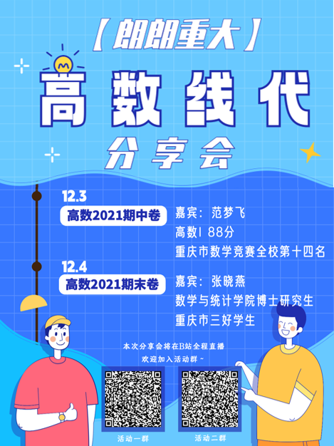 在期末考试周临近之际,为缓解同学们的高数线代复习压力,帮助同学们更好巩固数学知识、学习解题技巧,由重庆大学学生会主办的朗朗重大高数线代复习分享会将于11、12月开展。