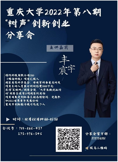 本次“树声”创新创业分享会嘉宾丰宇宸是重庆市创新能力提升先进个人,“互联网+”国赛金奖获得者,项目成果受孙春兰副总理检阅,受邀参加2022世界青年发展论坛,有着丰富的创新创业经验 ,主要给同学们分享了有关于创新创业竞赛的相关经验并对同学们的一些疑问进行详细的回答。本次分享会通过嘉宾的经验分享和问答互动,力求培养大学生创新创业意识,激发大学生创新思维,进一步增强大学生在创新创业大赛以及未来创新创业过程中的综合能力。