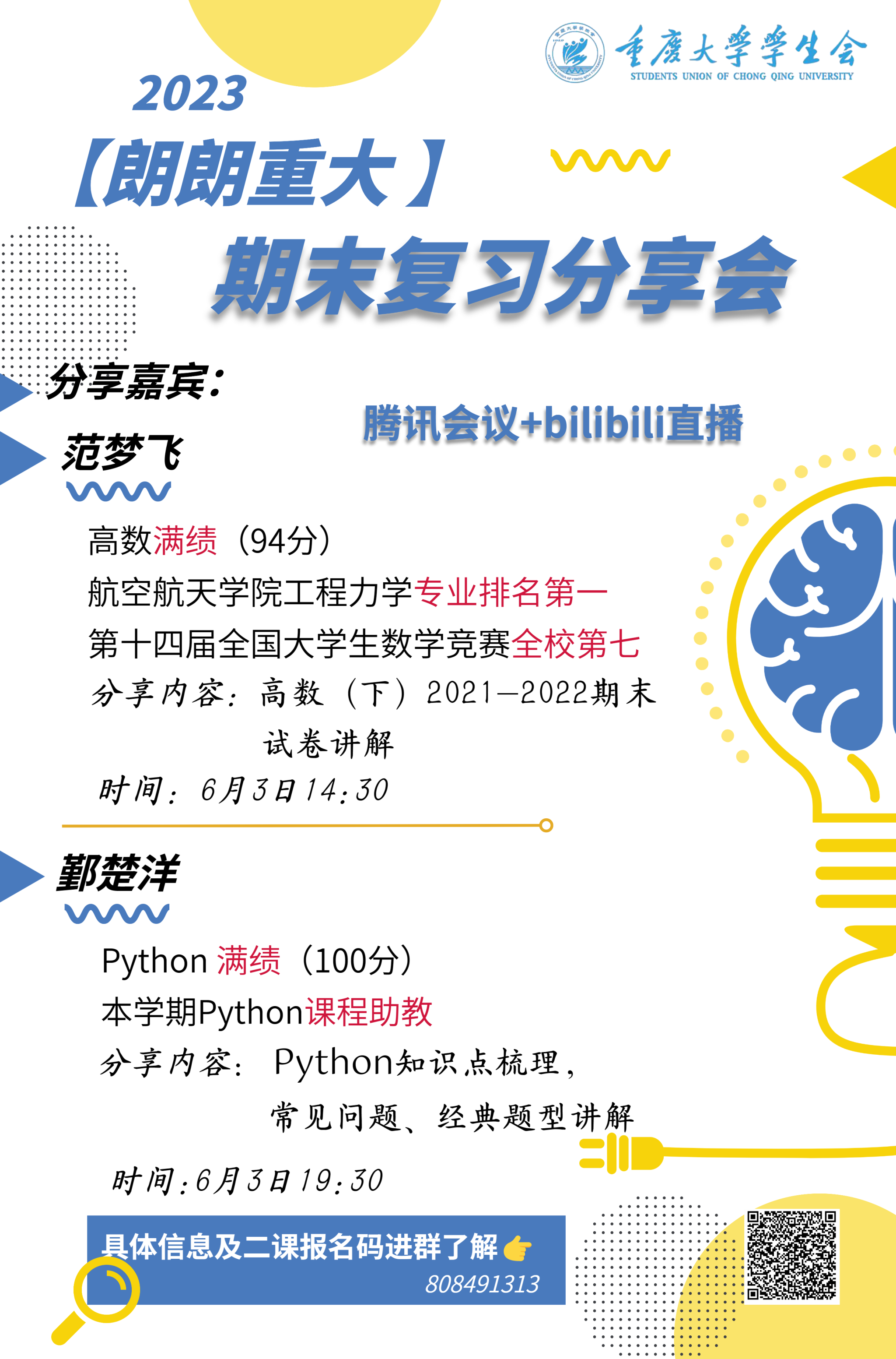 在期末考试周临近之际,为缓解同学们的期末复习压力,帮助同学们更好巩固各科知识、学习解题技巧,由重庆大学学生会主办的朗朗重大期末复习分享会将于6月开展。