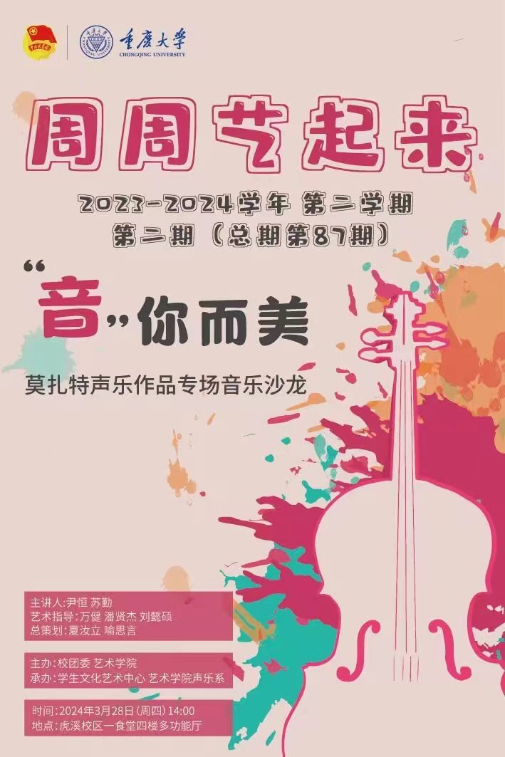 莫扎特的音乐旋律活泼悠扬,在我们耳边回荡,慰藉着我们的心灵,向世界传递着欢乐与美。为了激发广大同学对艺术的热情,营造高雅的校园文化氛围,重庆大学“周周艺起来”活动第二期(系列活动第87期)将于本周四在重庆大学虎溪校区一食堂四楼多功能厅开展,本次活动主题为“‘音’你而美——莫扎特声乐作品专场音乐沙龙”,让我们走进莫扎特的世界,聆听历史的回响。