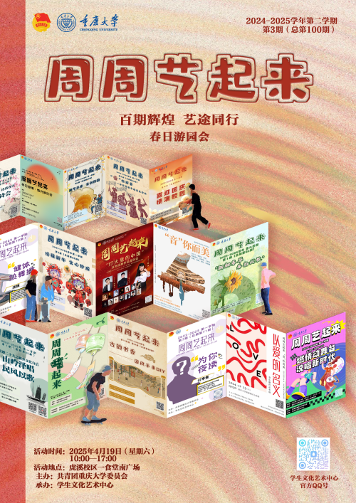 春光正好,艺术正当时。为进一步丰富课余生活,营造校园文艺氛围,重庆大学学生文化艺术中心2024-2025学年第二学期第三期“周周艺起来”活动(系列活动总第100期)将于4月19日(本周六)10:00-17:00在重庆大学虎溪校区一食堂南广场与大家见面!本次活动主题为“百期辉煌·艺途同行”,将以春日游园会的形式开展。这里不仅有精彩的舞台表演,更有丰富多元的手工制作、传统文化、竞技游戏。从1到100,是热爱的100种模样,让我们共赴游园会,以艺术为约,共绘百期辉煌!