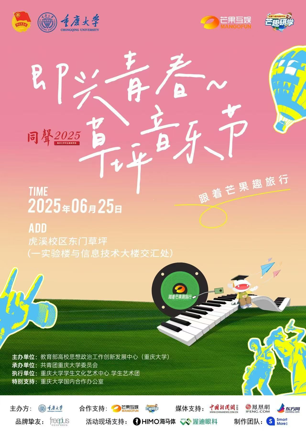夏日、草坪、音乐节,是独属于炎夏的浪漫,是独属于青春的狂欢。为促进广大师生积极参与到校园文艺建设,提升校园文化艺术氛围,重庆大学2025年即兴青春·草坪音乐节将于6月25日(周三)在重庆大学虎溪校区东门草坪(一实验楼与信息技术大楼交汇处)举行,本次音乐节以青春为底色,旨在为重大师生打造自由、活力的音乐现场。这里有多样音乐表演,用旋律传递青春热忱,让师生在草坪上沉浸式感受音乐魅力,共赴一场属于青春的音乐狂欢,跟着芒果趣旅行,解锁校园音乐新体验 。