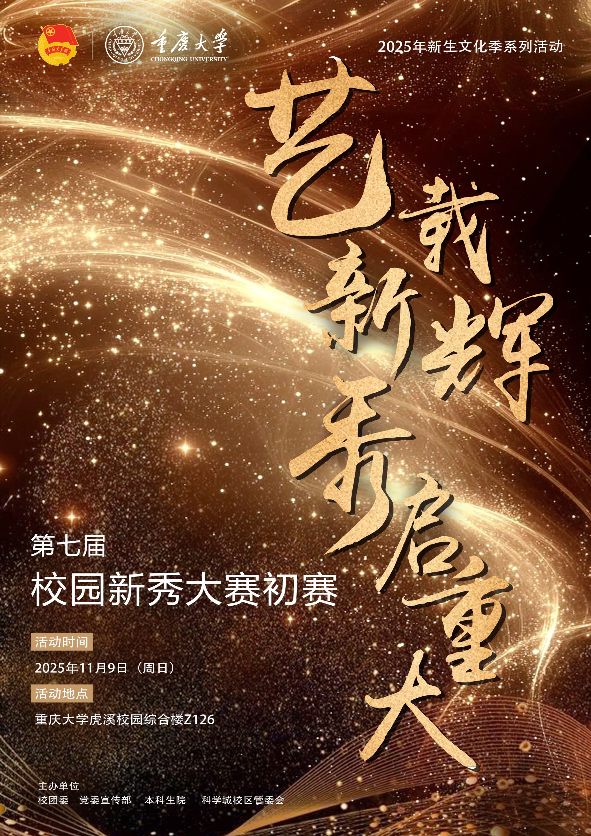 以梦想之名,赴新秀之约,让才华在聚光灯下绽放,让青春因勇气熠熠生辉。为鼓励新生积极参与校园文艺建设,提升校园文艺氛围,重庆大学第七届校园新秀大赛初赛将于2025年11月9日(周日)在重庆大学科学城校区综合楼Z126举行,让我们一起见证新生闪耀的舞台,共享视听盛宴。