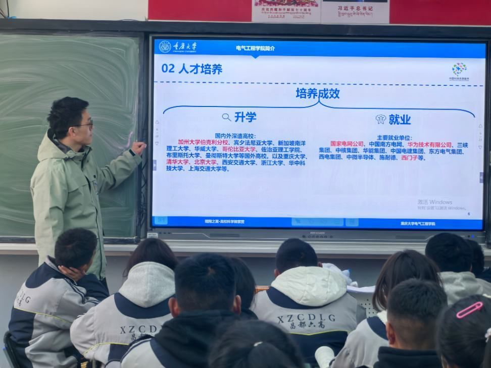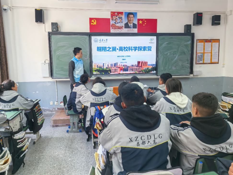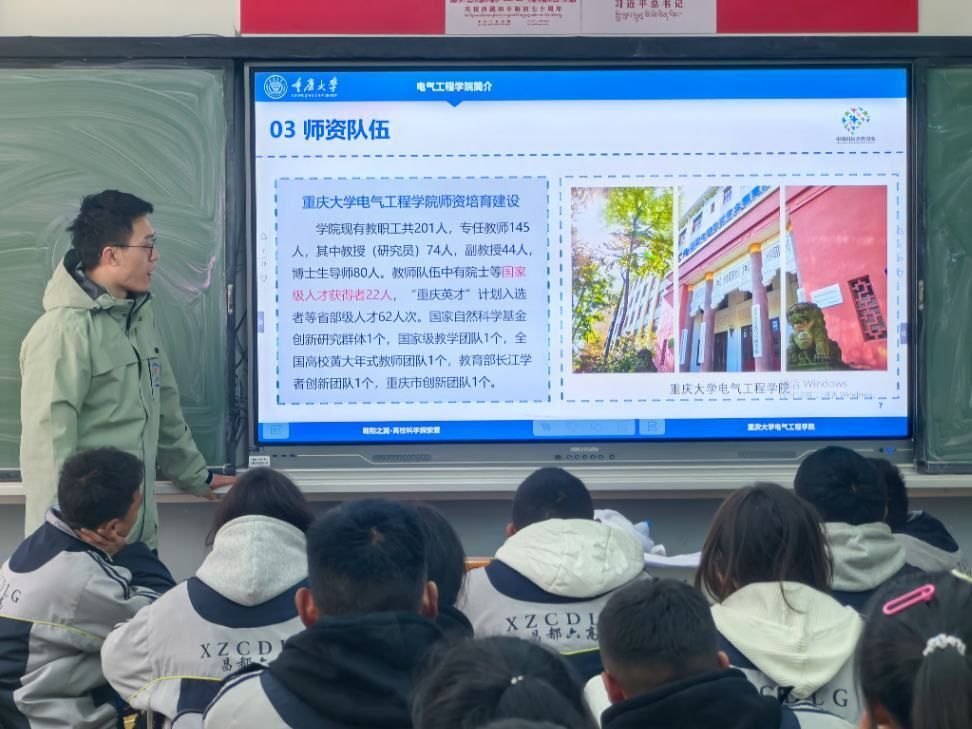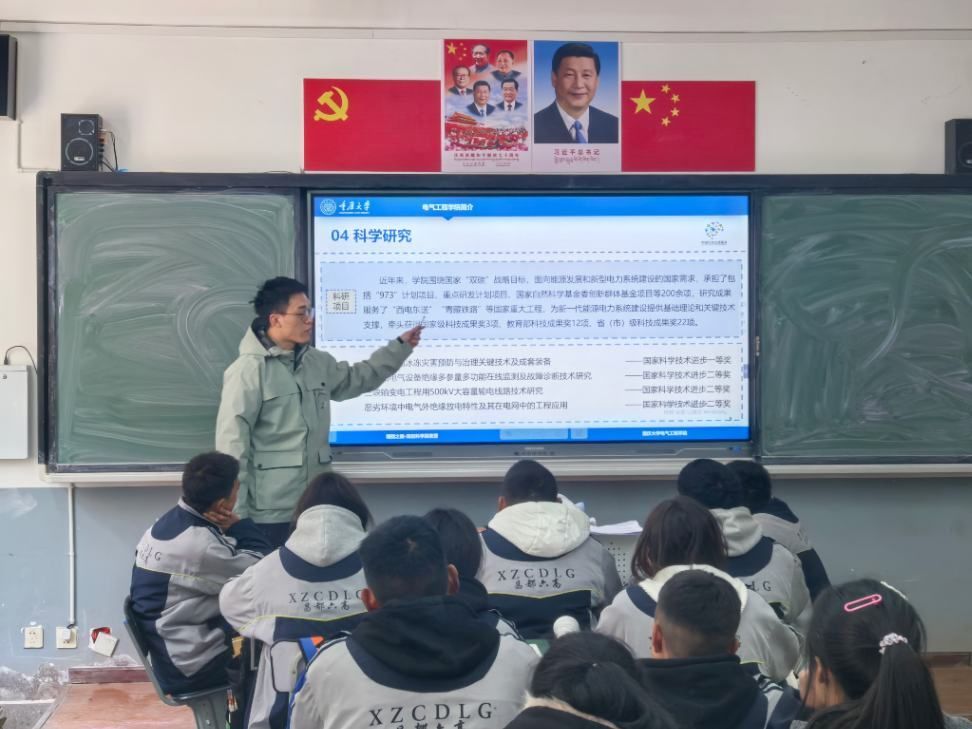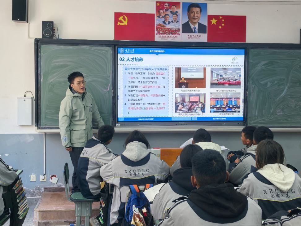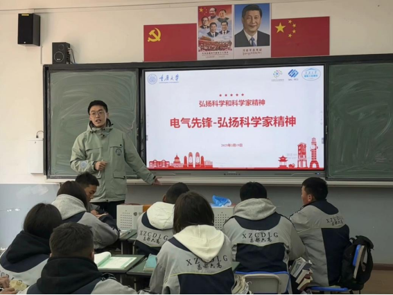 2025年3月19日,昌都市第六高级中学的教室内,藏族学生们清澈的眼眸里闪烁着求知的光芒。志愿者们精心设计的“高校科学探索营”和“弘扬科学家精神”科普活动,犹如一把打开科学宝库的金钥匙。从重庆大学电气工程学院的院史长廊到输变电装备技术全国重点实验室的线上参观,从电路原理到新能源技术前沿,知识的甘霖浸润着每颗年轻的心。志愿者以整体概况、人才培养、师资队伍、科学研究、国际交流五个方面展开,向同学们介绍了重庆大学电气工程学院。同学们对于未来的大学生活有了一定的认识,有不少同学表示希望能够考上重庆大学电气工程学院,期待着能够参观输变电装备技术全国重点实验室。