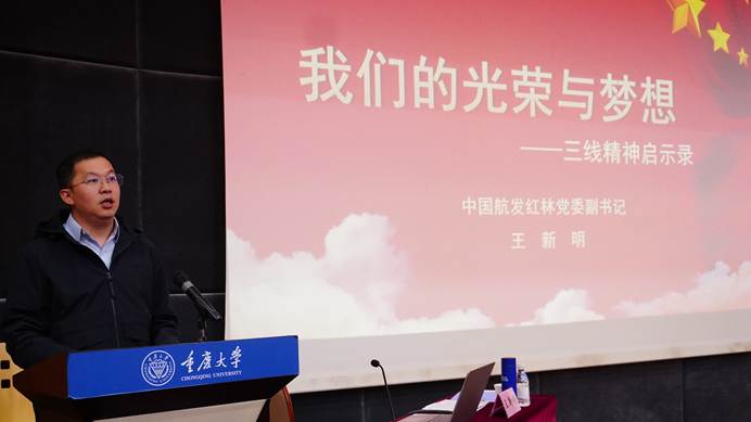 “励德树声”名师大讲堂上,王新明以“感谢、感动、感怀”开篇,感谢重庆大学的邀请与接待,点赞重大“耐劳苦、尚俭朴、勤学业、爱国家”的校训精神,并提及参观重大防空洞的深刻触动,引用校歌“复兴民族兮,誓作前锋”引发学子共鸣。他以《我们的光荣与梦想》为题开讲,结合自身“航二代”投身三线建设的经历,以“回顾、传承、启示、奋斗”为主线,讲述了贵州航发人在山沟里坚守三十年、助力歼七歼八装上“中国心”的“三线神奇”。