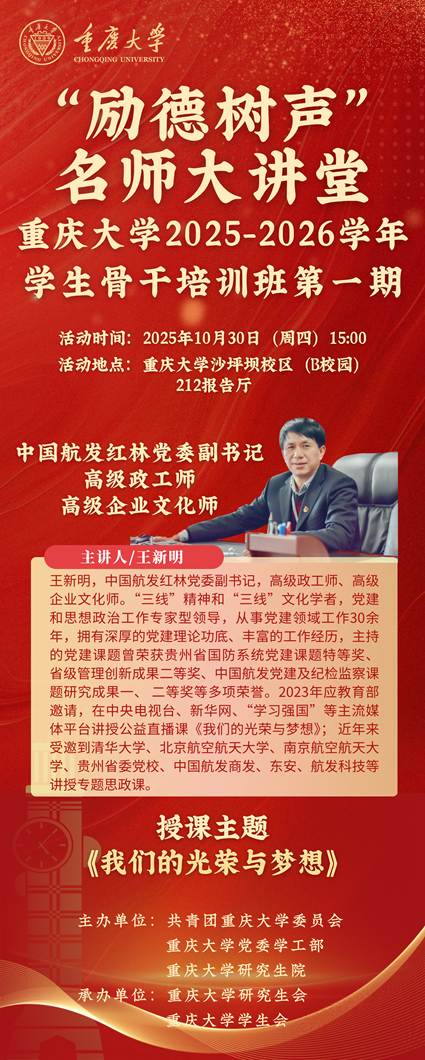 10月30日下午,“励德树声”名师大讲堂暨重庆大学2025-2026学年学生骨干培训班开班仪式在重庆大学沙坪坝校区(B校园)212报告厅隆重举行。中国航发贵州红林航空动力控制科技有限公司党委副书记、党建与思想政治工作专家王新明出席现场,活动由重庆大学团委书记于佳佳主持。