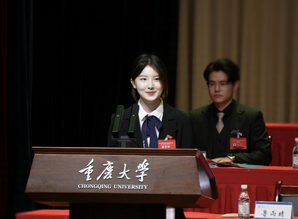 兄弟高校代表、清华大学研究生会主席团成员鲁雨晴同学致辞。她回顾了重庆大学“研究学术、造就人才”的办学初心,充分肯定了重庆大学学生会、研究生会在落实立德树人根本任务、服务同学成长成才、促进全面发展以及加强校际交流等方面所做的扎实工作和取得的积极成效。她提出,希望与重庆大学学生会、研究生会在“彰显政治底色、鲜亮群团特色、充盈青春本色”三方面携手努力,并希望重庆大学青年学子在“十五五”新征程中,牢记党的教诲,立志民族复兴,在青春赛道上奋力奔跑。